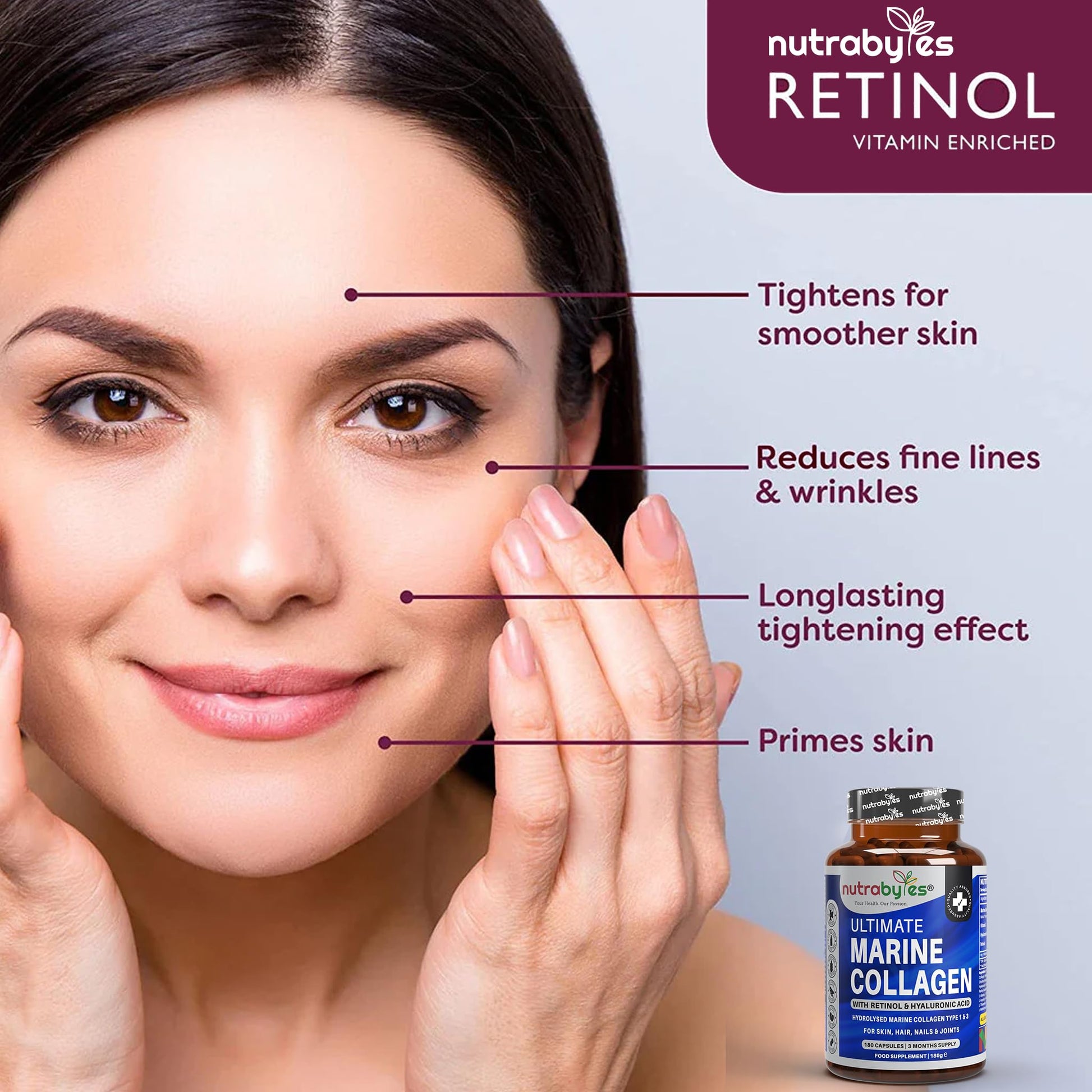 Ultimate Marine Collagen Supplement with Hyaluronic Acid, Retinol and Vitamin C | 180 Capsules - 3 Months Supply | Hydrolysed Marine Collagen Peptides Type 1 & 3 | Hair, Skin, Nails & Joints | Marine Collagen Supplement for Women and Men | Made in UKMore Info