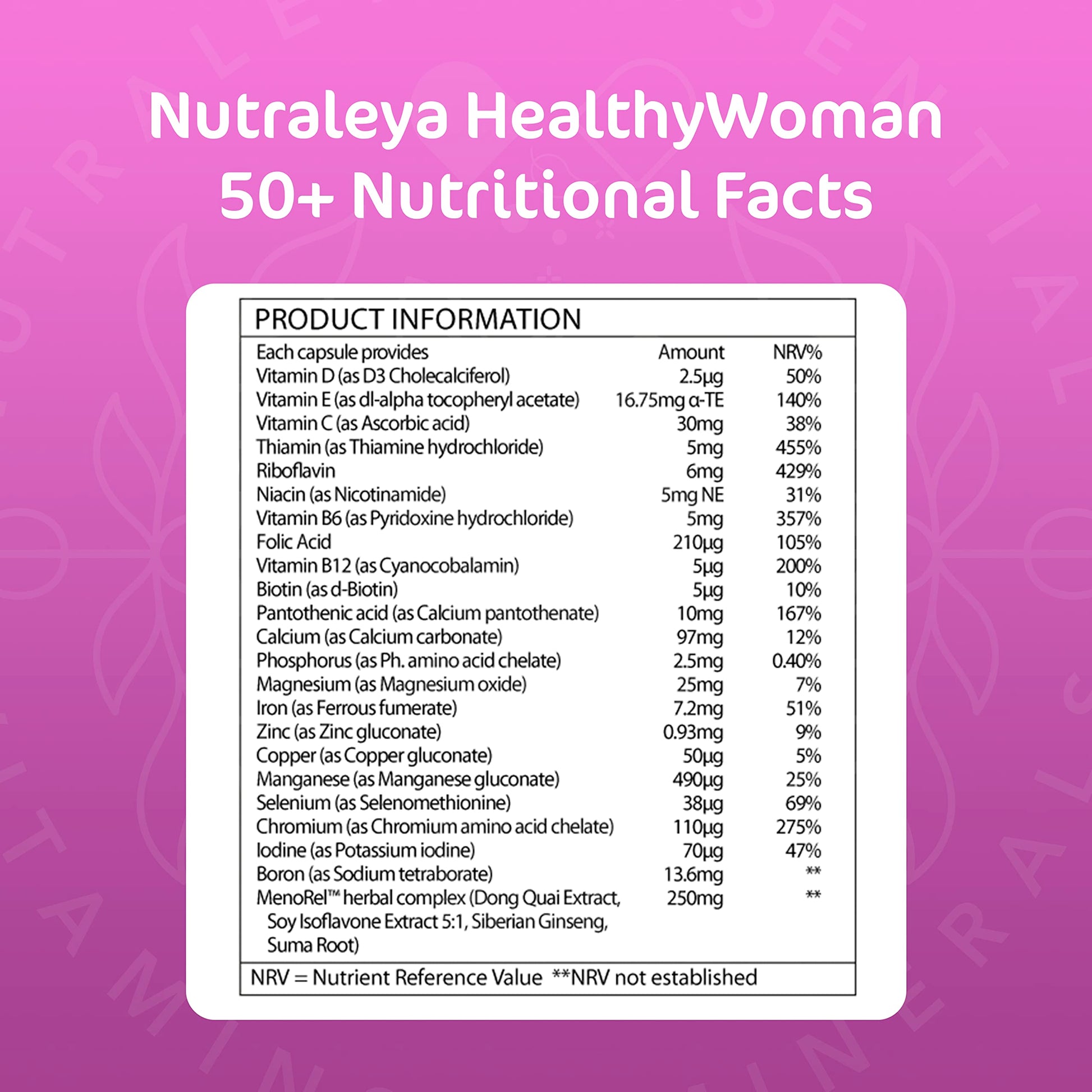 Age Gracefully with Our Over 50s Multivitamins Women! Stay on top of your wellness with our Healthy Women 50+ multiple vitamin & mineral combination supplements. Made with a potent combination of essential vitamins, minerals, and herbal extracts, these capsules will help support your midlife transition for vibrant ageing. Our all-in-one multi vitamins 50 women contains vitamins B6, C, D, calcium, magnesium, zinc, selenium, thiamine, biotin, and pantothenic acid, which help support your vitality and strengthen your body's functions. These dong quai capsules also assist in energy production and help promote cognitive processes, concentration, and memory, so you can take on the day with full confidence. These energy vitamins women also support normal collagen production, so women going through menopause can look as young as ever. These supplements help nourish and strengthen dull skin, hair, and nails. Each serving of our Healthy Women 50+ Multivitamin and Minerals contains: Dong Quai Extract Soy Isoflavone Extract 5:1 Siberian Ginseng Sums Root Vitamin C Vitamin D Vitamin E Thiamine Riboflavin Niacin Vitamin B6 Vitamin B12 Folic Acid Biotin Pantothenic Calcium Phosphorus Magnesium Iron Zinc Copper Manganese Selenium Chromium Iodine Boron Product Features: 60 Capsules 100% Natural GMP Certified Vegetarian Halal and Kosher Friendly No Animal Fats No Artificial Flavours, Colours or Preservatives Made in the UK To get your needed daily nutritional support, take 1 capsule daily after a well-balanced meal. At Nutraleya, we provide a comprehensive selection of wellness essentials to suit every lifestyle. Our vegetarian, halal, and vegan vitamins and supplements contain only natural ingredients for maximum nutritional benefit. All our products have been carefully formulated and developed by a team of experts using only the most advanced state-of-the-art machines. Empower your lifestyle with Nutraleya today.More Info