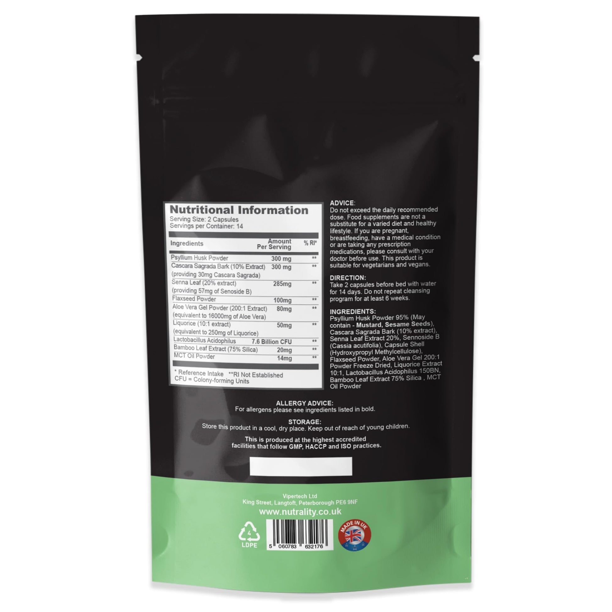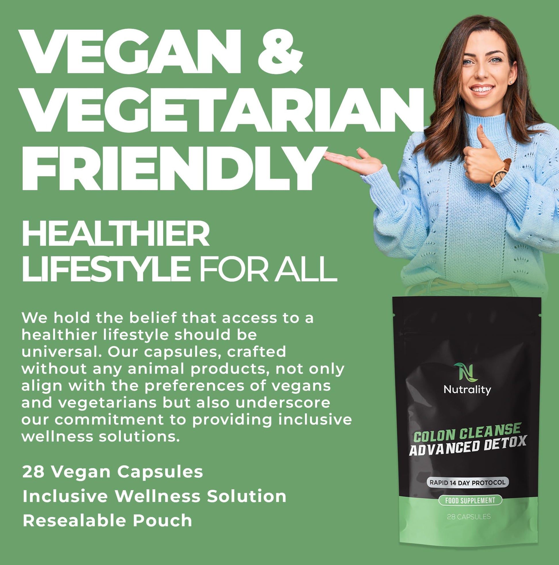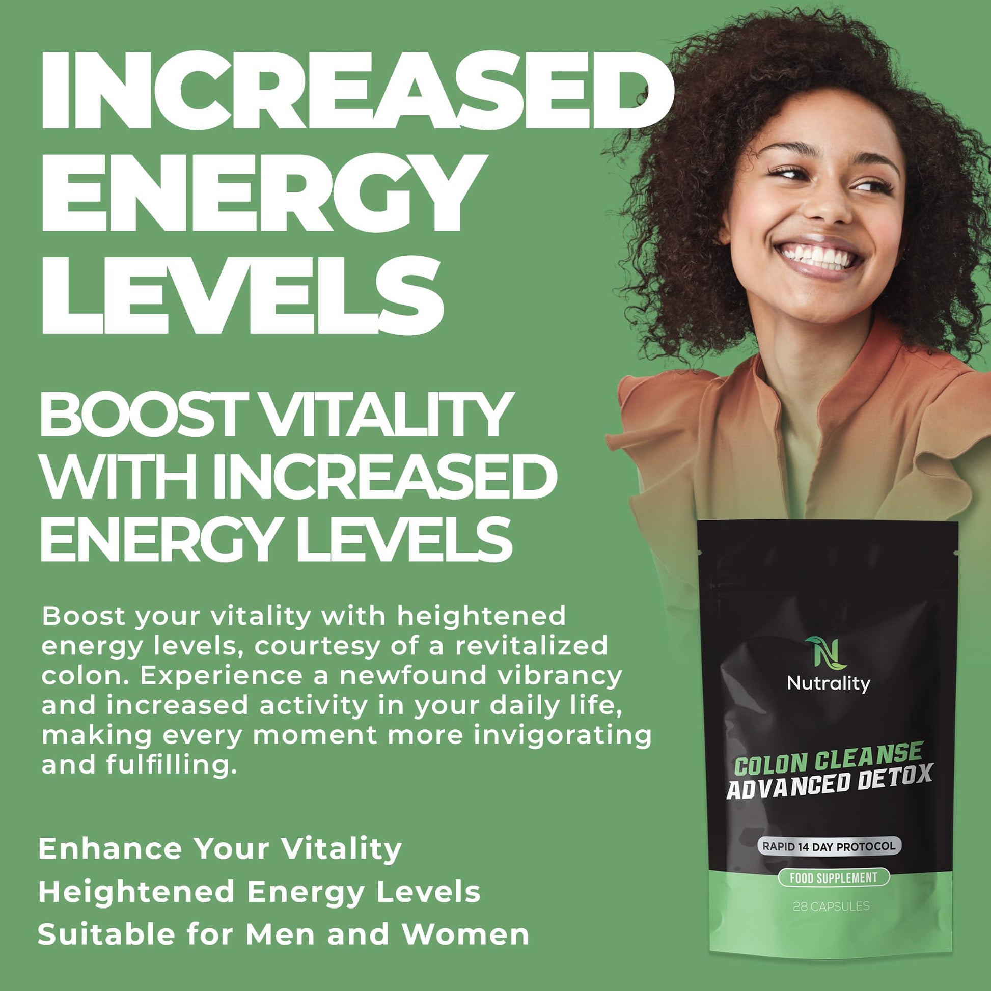 Your digestive system plays a pivotal role in your overall health. Over time, toxins and waste can accumulate in your colon, leading to discomfort, sluggishness, and a feeling of being weighed down. Nutrality Colon Cleanse Advanced Detox is here to help you reclaim your vitality and well-being. Our carefully selected ingredients work in harmony to gently cleanse your colon, removing built-up waste and promoting a more efficient digestive system. This can lead to benefits such as increased energy, improved nutrient absorption, and reduced bloating. We prioritize your health, and our capsules are suitable for both vegans and vegetarians.More Info