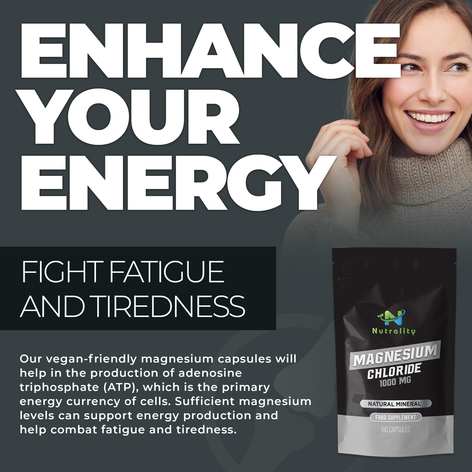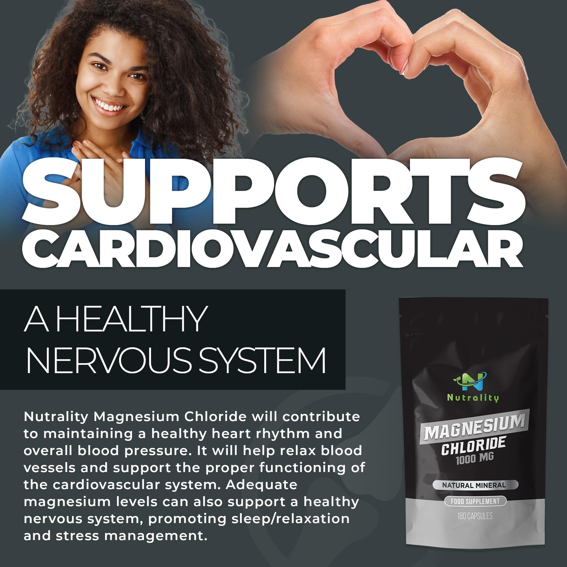 Nutrality Magnesium Chloride Supplement 1000mg | for Men & Women | for Sleep,Constipation, Digestion, Bone Health & Relaxation | Vegan | 180 Capsules