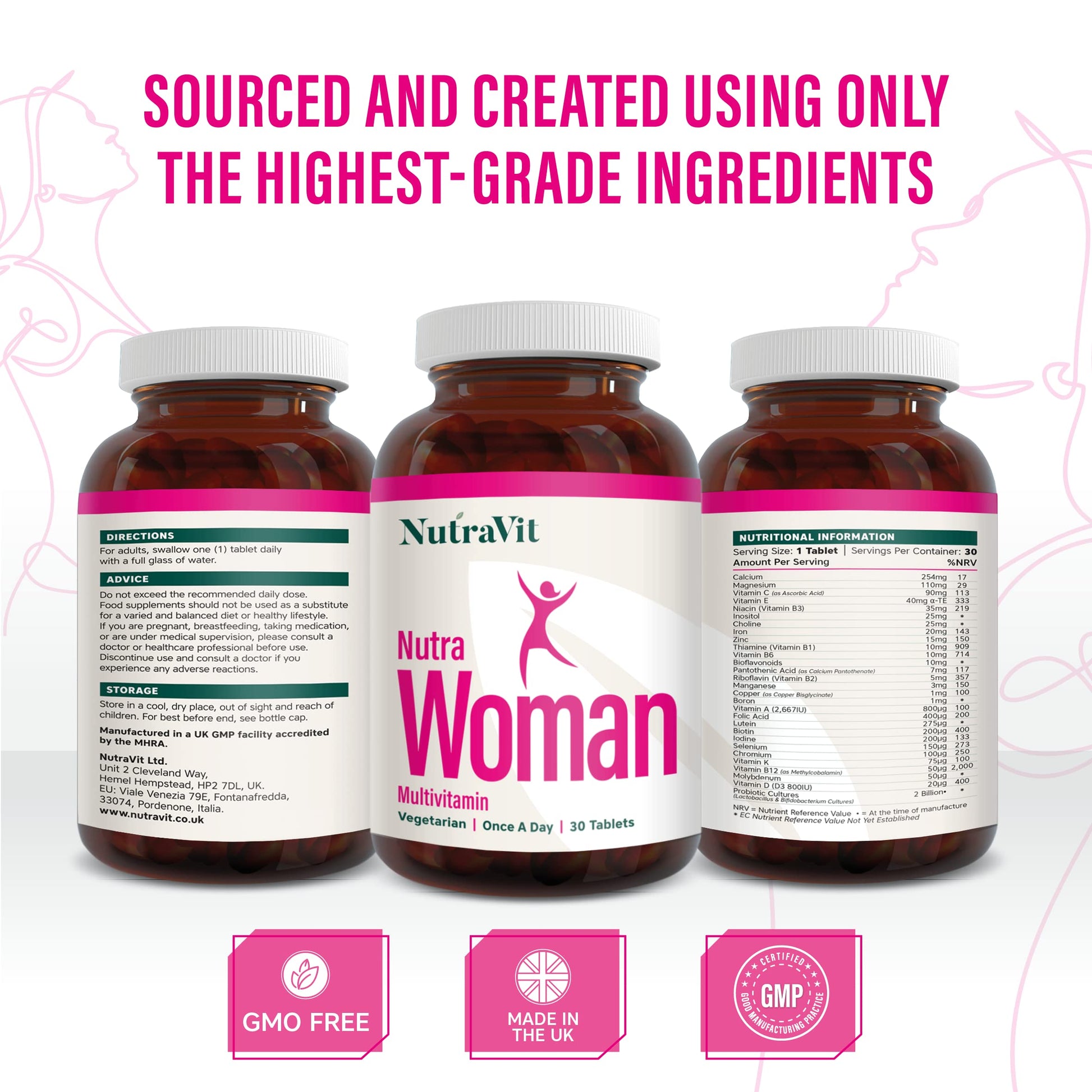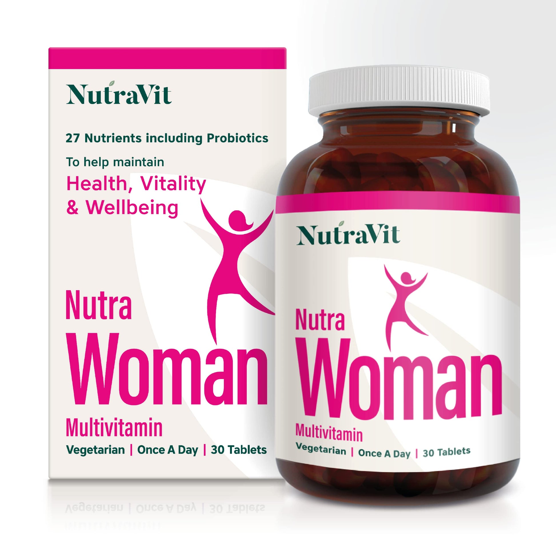Nutra Woman is a specifically designed multivitamin for women to help maintain health & vitality, whilst providing support to energy levels to get you through the day. The ultimate vitamin supplement for women. Our Multivitamin Tablets for Women contain 27 Active Vitamins & Minerals, including Biotin, Iron & 100% NRV of Folic Acid with Hyaluronic Acid. These ingredients have been meticulously selected to specially support women on a daily basis. We recommend taking one tablet per day. Nutra Woman contains Vitamin B6 which contributes to the regulation of hormonal activity, Zinc and Biotin which contributes to the maintenance of normal hair and skin and Vitamin C and Iron which contributes to the reduction of tiredness and fatigue. Each tablet contains 27 nutrients including Vitamin A (2,667 IU), Thiamine (Vitamin B1), Riboflavin (Vitamin B2), Niacin (Vitamin B3), Pantothenic Acid (as Calcium Pantothenate), Vitamin B6, Vitamin B12 (as Methylcobalamin), Vitamin C (as Ascorbic Acid), Vitamin D (D3 800 IU), Vitamin E, Vitamin K, Folic Acid , Biotin, Magnesium, Calcium, Iron, Zinc, Copper (as Copper Bisglycinate), Manganese, Selenium, Chromium, Iodine, Boron, Molybdenum, Inositol, Lutein, Bioflavonoids, Choline, Probiotic Cultures. Our Women's Multivitamin Tablet comes with a wealth of health benefits. Though the full list of benefits is too extensive to detail, some of the health benefits associated with some of the 27 essential active vitamins & minerals are reduction of tiredness & fatigue; maintenance of the normal function of the immune system; maintenance of normal bones, teeth, hair and skin; and regulation of hormonal activity. Vitamin B6 contributes to the regulation of hormonal activity. Vitamin D, K, Zinc & Manganese contribute to the maintenance of normal bones. Vitamin D contributes to the maintenance of normal teeth. Zinc, Biotin and Selenium contribute to the maintenance of normal hair.More Info