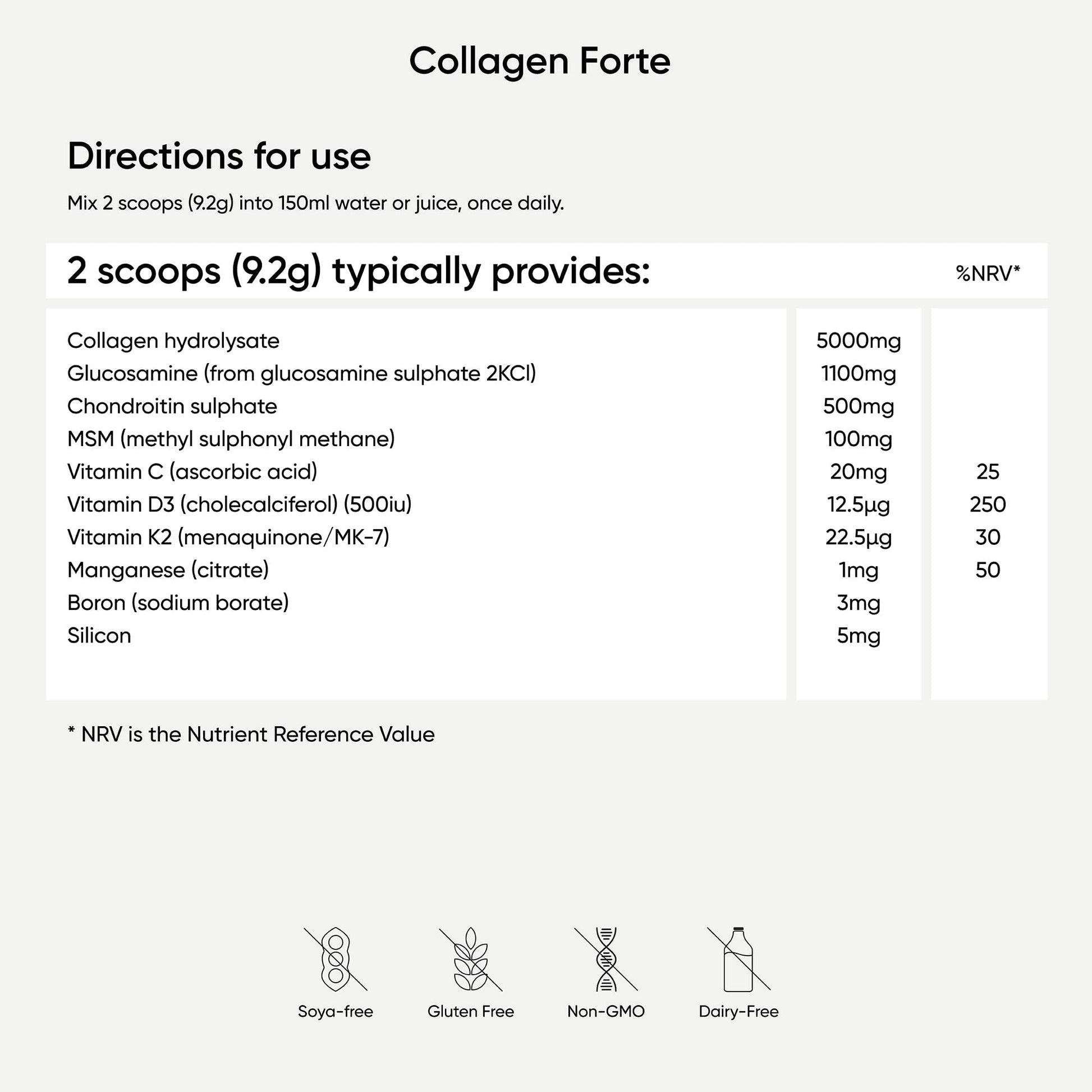 Collagen Forte is a unique formulation providing high dose and bioavailable collagen in combination with a targeted and synergistic blend of nutrients for joint and bone health, and provide support for connective tissue. The collagen in Collage Forte is from a bovine source and provides type 1 collagen which is the most abundant type in the human body.More Info