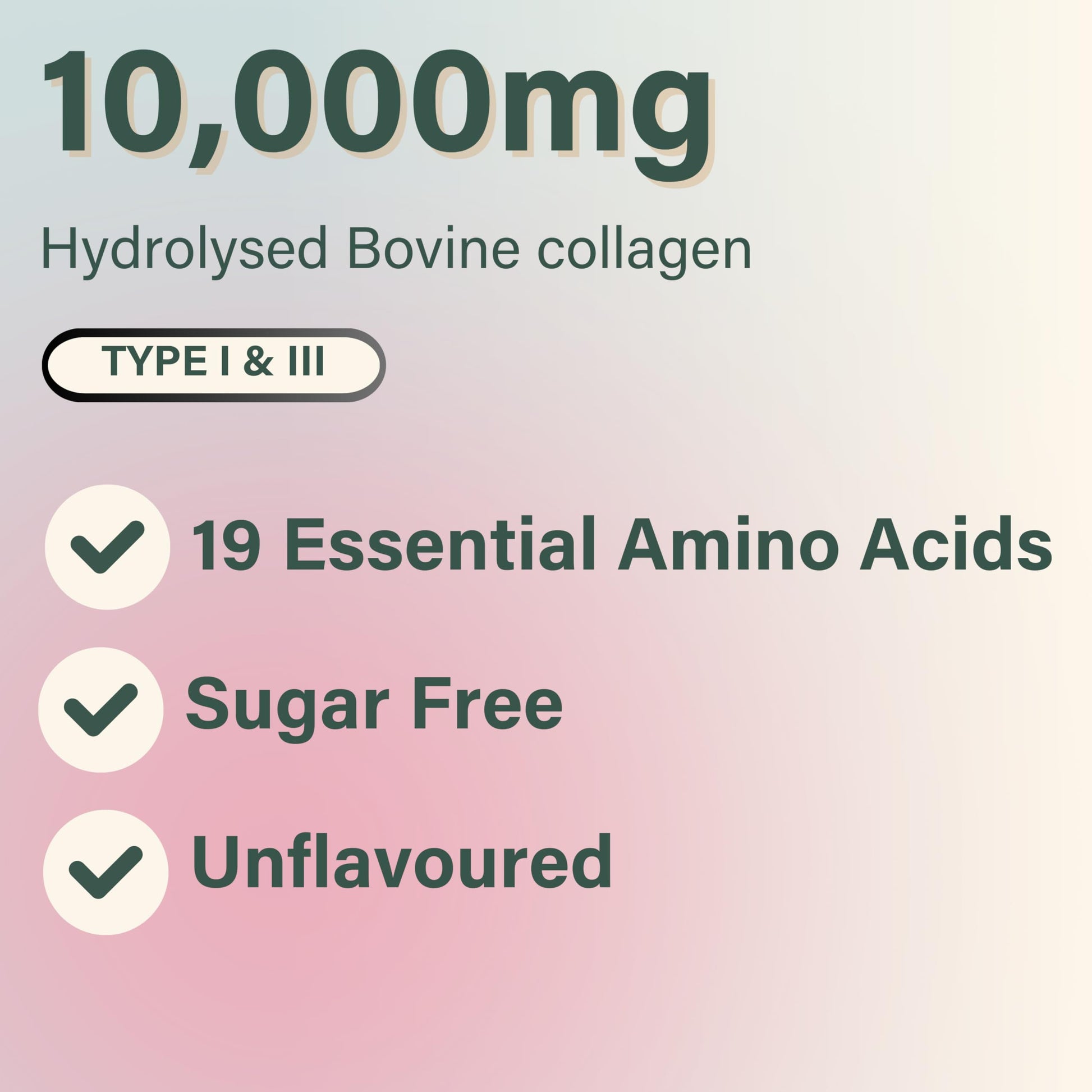 10,000 MG HYDROLYZED GRASS FED BOVINE COLLAGEN, SUGAR-FREE: Our collagen powder features premium hydrolyzed bovine collagen types I and III, delivering essential nutrients for firmer skin, healthier hair, and stronger nails. Collagen depletion begins as early as 18 to 29 years old, with an annual 1-2% loss from age 30 onwards. Nutri Beauties' powder provides 10,000mg of pure bovine collagen per serving, packed with unique proteins and 19 essential amino acids that promote anti-aging, enhancing skin, hair, nails, and joint health. Bovine collagen is well-known for its robust support for bones and joints, making it ideal for overall body wellness. PERFECT FOR DRINKS, COOKING & BAKING: Nutri Beauties' collagen powder dissolves effortlessly in drinks like coffee and smoothies, and remains heat stable (up to 300°C). Add it to your favorite recipes like protein balls, muffins, soups, and stews for a daily collagen boost without altering the flavor. NO UNPLEASANT AFTERTASTE: Our collagen powder is unflavoured and neutral-tasting, ensuring no aftertaste. It’s free from gluten, GMOs, and additives, and is Halal certified for peace of mind. 35-DAY SUPPLY: Each 350g pack provides a full 35-day supply, offering more than many other products on the market. Nutri Beauties' bovine collagen is manufactured in Europe under strict EU regulations and features a high-strength formula that is more absorbable and effective. It delivers 10x the strength of common collagen tablets and capsules, making it an excellent choice for both men and women. Caffeine-Free, Paleo-Friendly, Keto-FriendlyMore Info