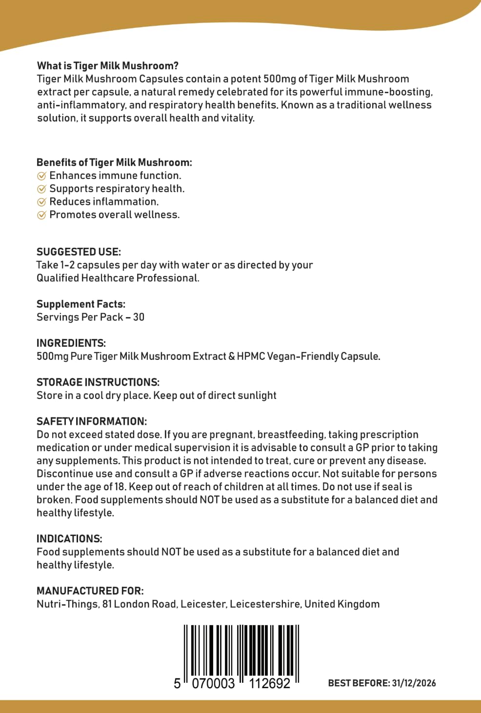 Each capsule delivers 500mg of Tiger Milk Mushroom extract, ensuring a potent dose when taken as recommended. With 60 capsules per pack, you're equipped with a full month's supply to consistently support your health journey.