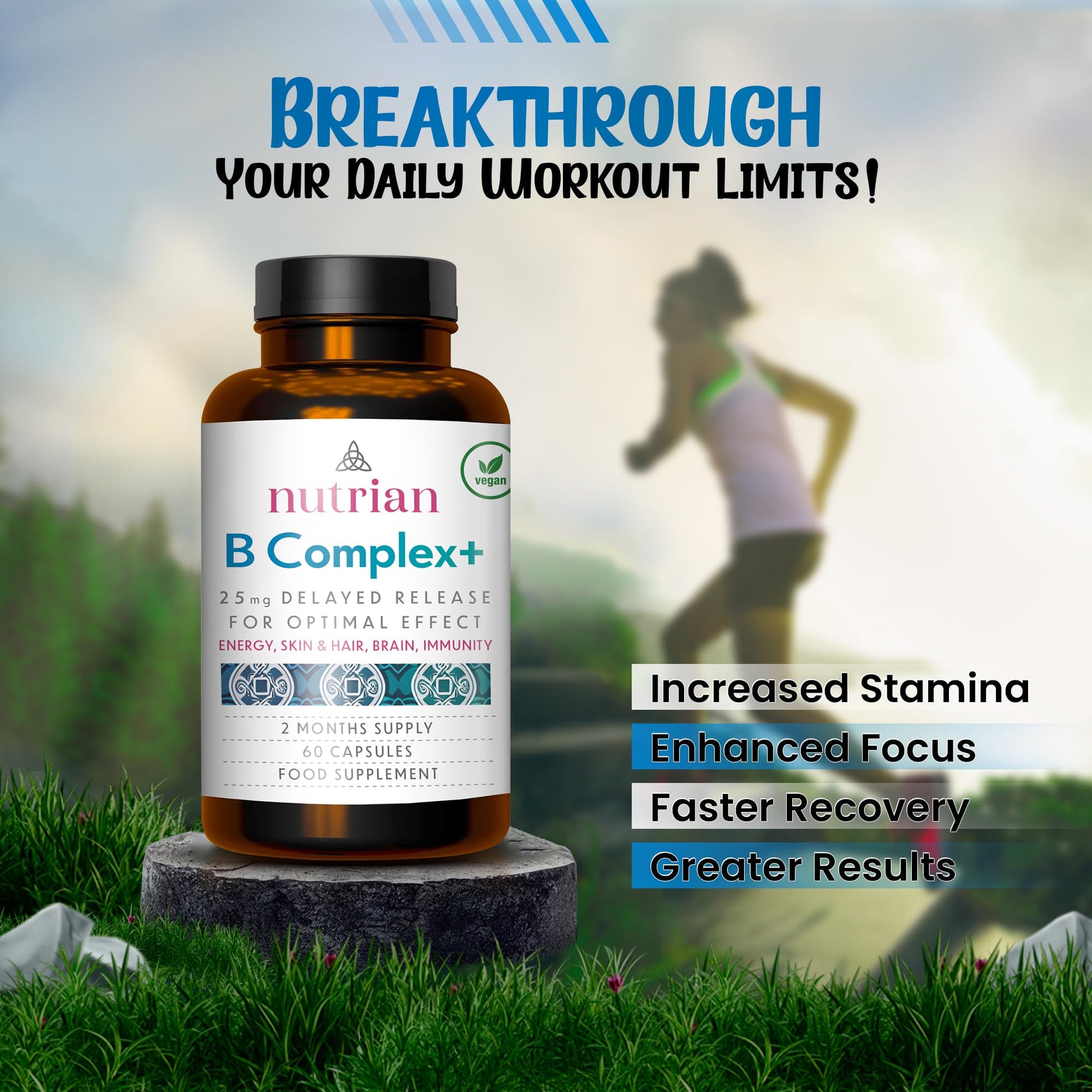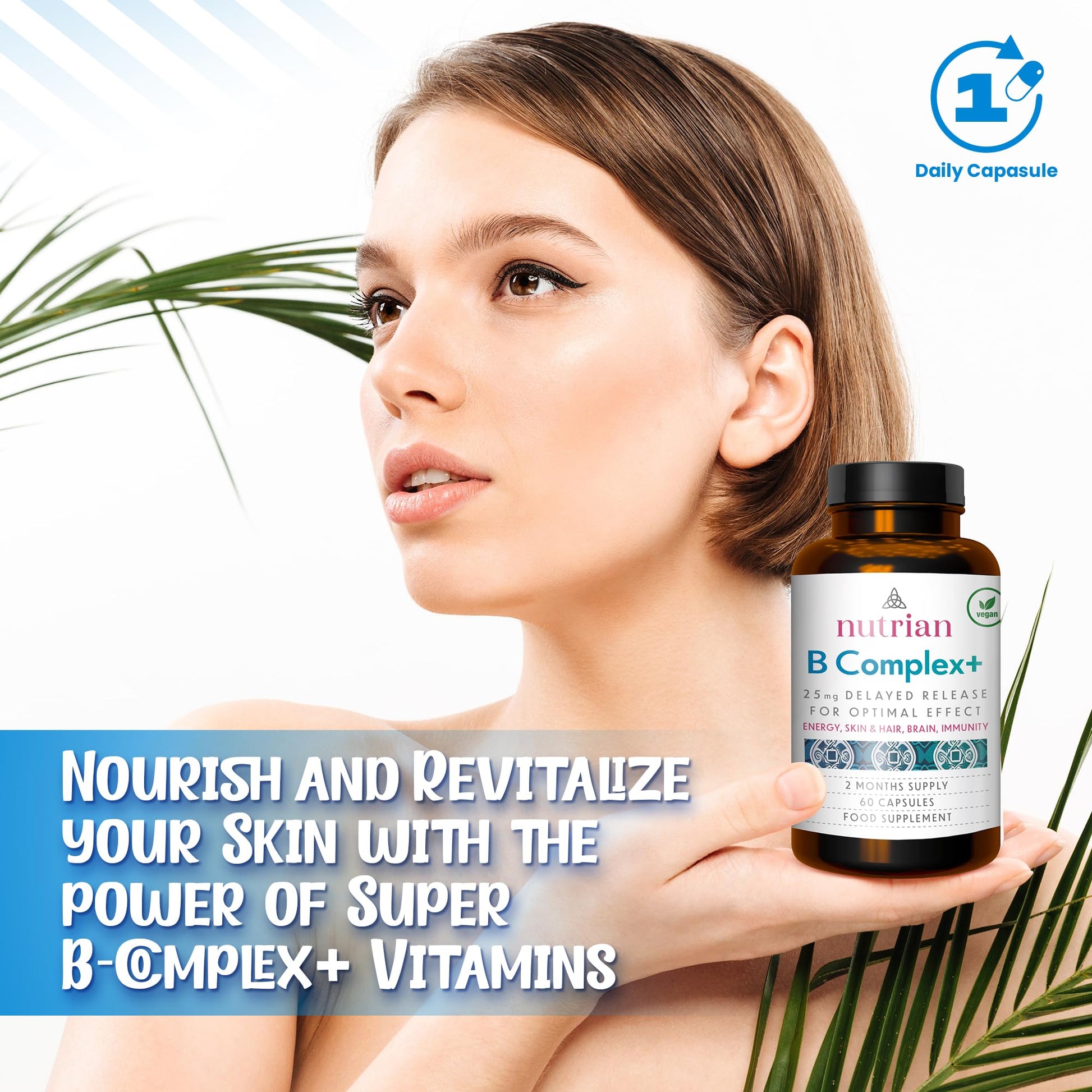 Why choose NUTRIAN B COMPLEX+? Our product stands out with its complete spectrum of essential B vitamins, carefully balanced to provide full support for both body and mind. The inclusion of Vitamin B1 and B5 aids in converting food into energy, helping you stay energized and fend off those midday slumps. Our formula also features Vitamin B6 and B12, which are vital for maintaining cognitive health. They help regulate mood, sharpen mental clarity, and reduce fatigue, ensuring you remain focused and positive throughout the day. For a radiant appearance, Vitamins B2 and Biotin work together to support healthy skin and strong hair, giving you a natural glow from the inside out. Immune support is another key benefit of NUTRIAN B COMPLEX+. With the addition of B12 Vitamin and Folate, this blend strengthens your immune system, helping you stay resilient and healthy. Our delayed-release formula ensures that the nutrients are gradually released into your bloodstream for optimal absorption. Enhanced with Inositol and PABA, the effectiveness of the B vitamins is further boosted. We provide each vitamin at effective doses that meet or exceed daily recommendations, and our formula is free from animal products, artificial additives, and unnecessary fillers. Additionally, NUTRIAN B COMPLEX+ includes Choline for enhanced brain health, Inositol for supporting cell membrane health, PABA for improved metabolic processes, and Folate in its most bioavailable form for superior absorption and cell repair. By choosing NUTRIAN B COMPLEX+, you're investing in a top-quality, vegan-friendly supplement that offers all-around support for energy, cognitive function, skin health, hair strength, and immune resilience. Elevate your wellness with a supplement that truly supports your health and vitality.More Info