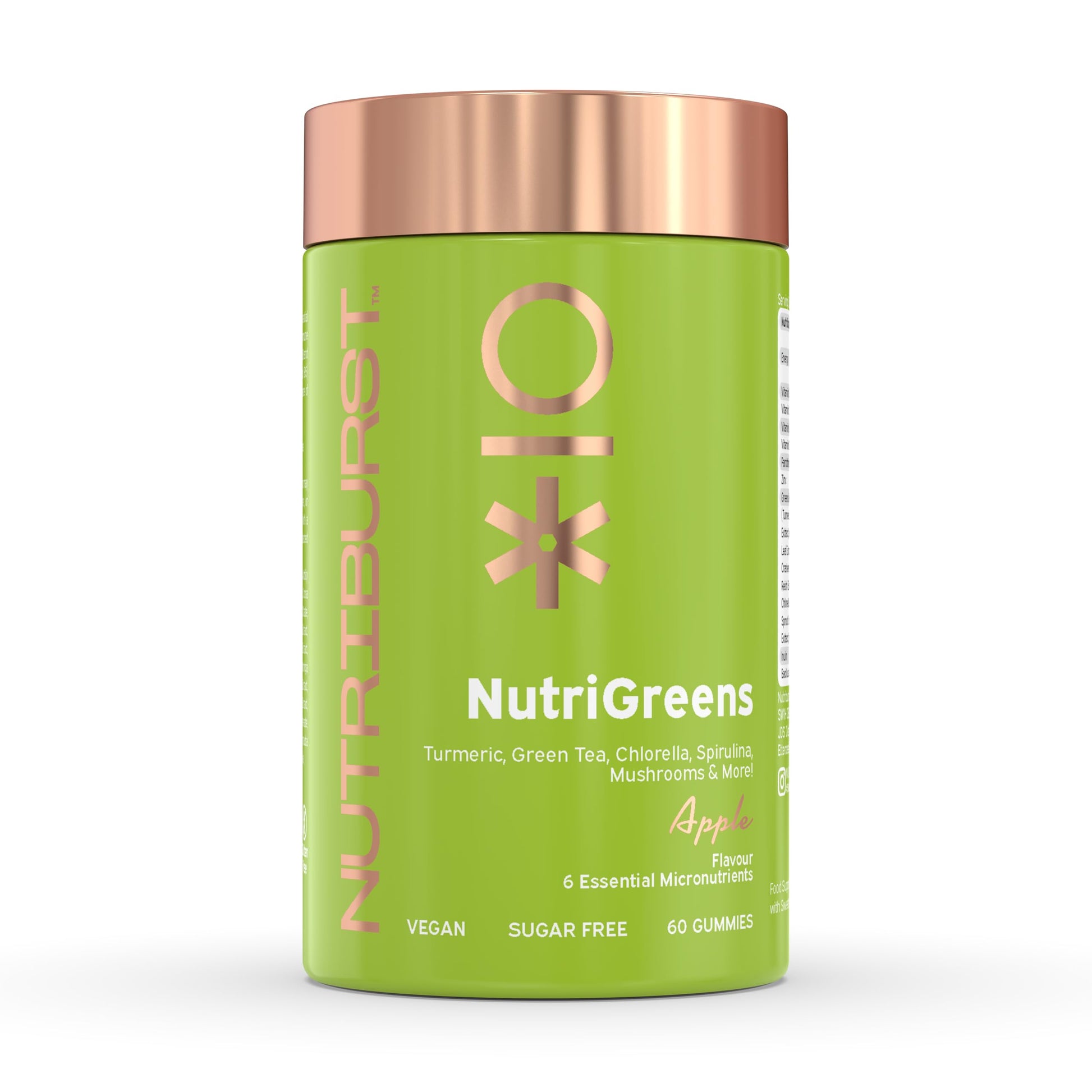 Green goodness in every bite. Formulated with a unique blend of 22 fruits, vegetables, herbs, mushrooms, and essential vitamins to support everyday health. Boosted with vitamins, Zinc, Inulin, and live bacteria cultures to support overall health. Supports a normal functioning immune system. Helps maintain healthy bones, teeth, and muscle function. Supports healthy hair, nails, and skin. Natural apple flavour. 01 Boosted with vitamins, Zinc, Inulin, and live bacteria cultures NutriGreens is a unique blend of fruits, vegetables, mushrooms, herbs, and essential vitamins to support everyday health with added Zinc, Inulin, and bacterial cultures. 02 Supports a normal functioning immune system. We added Vitamin C to help contribute to a healthy immune system and help protect cells from oxidative stress. 03 Helps maintain healthy bones, teeth, and muscle function. We added a natural and vegan source of Vitamin D to help maintain healthy bones, teeth, and muscle function. 04 Helps reduce tiredness and fatigue. We ensured our formulation had Vitamin B6 and B12 to aid in maintaining a normal energy-yielding metabolism and help fight tiredness and fatigue. Vitamin B5 (also known as Pantothenic Acid) helps support mental performance. 05 Supports healthy hair, nails, and skin Our formula wouldn't be complete without Zinc, an essential mineral to help maintain the appearance of hair, nails, and skin. Why choose Nutriburst? High quality ingredients, high quality vitamins. Informed Sport Certification, HACCP Certified Food Safety, Global Retailer & Manufacturer Alliance, Halal permitted. How to use Take 2 gummies a day with food at whichever time suits your routine bestMore Info