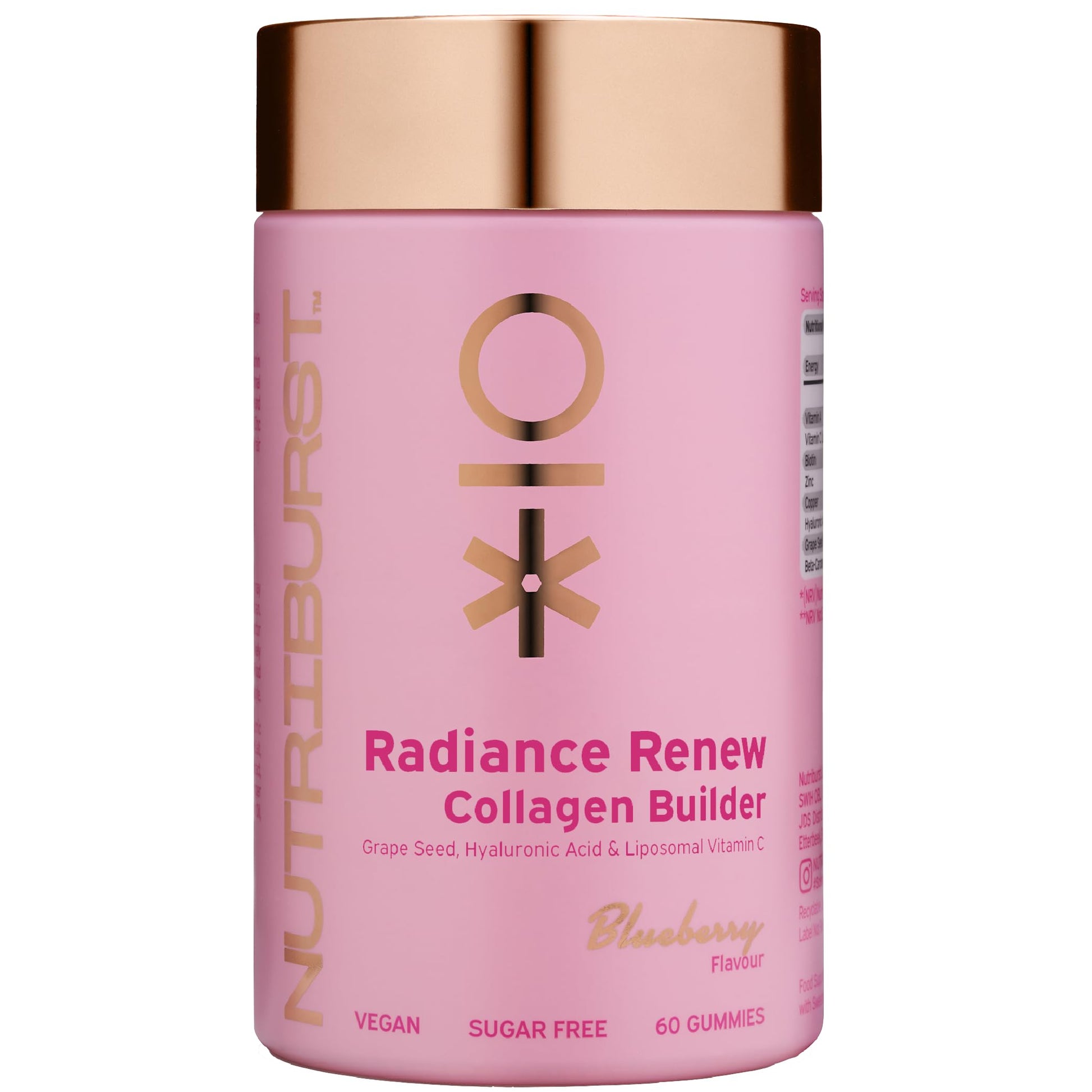 Bite-sized vegan collagen booster formulated with 6 essential micronutrients: Biotin, Hyaluronic Acid, and more. Formulated with a unique blend of Grape Seed, Hyaluronic Acid, essential nutrients, and vitamins to support the body’s natural collagen production. Boosted with Vitamin C to help improve collagen production and support skin, bones, and teeth. Infused with Copper and Biotin to help maintain healthy hair, skin, and nails. Natural blueberry flavour. 01 Vegan collagen booster. Collagen is the most abundant protein in the human body and a vital component of various connective tissues like skin, bones, tendons, ligaments, and cartilage. As we age, the body's natural collagen production decreases. Rather than using animal-based collagen, we opted for a naturally vegan collagen-boosting blend that helps the body naturally produce more on its own and is ideal for those with dietary restrictions. 02 Expertly formulated with a unique blend of 6 micronutrients. Our Revive Collagen vitamin gummy is enhanced with Grape Seed, Hyaluronic Acid, essential nutrients, and vitamins to support the body’s natural collagen production. 03 Boosted with Vitamin C. We added Vitamin C to help support the body’s collagen production and the normal function of teeth, bones, gums, cartilage, skin, and blood vessels. 04 Helps maintain healthy hair, skin, and nails. The unique blend of Vitamin A, Biotin, and Zinc helps maintain healthy hair, skin, and nails with added Copper to support normal hair and skin pigmentation. Why choose Nutriburst? High-quality ingredients, high-quality vitamins. Informed Sport Certification, HACCP Certified Food Safety, Global Retailer & Manufacturer Alliance, Halal permitted. How to use Take 2 gummies a day with food at whichever time suits your routine bestMore Info