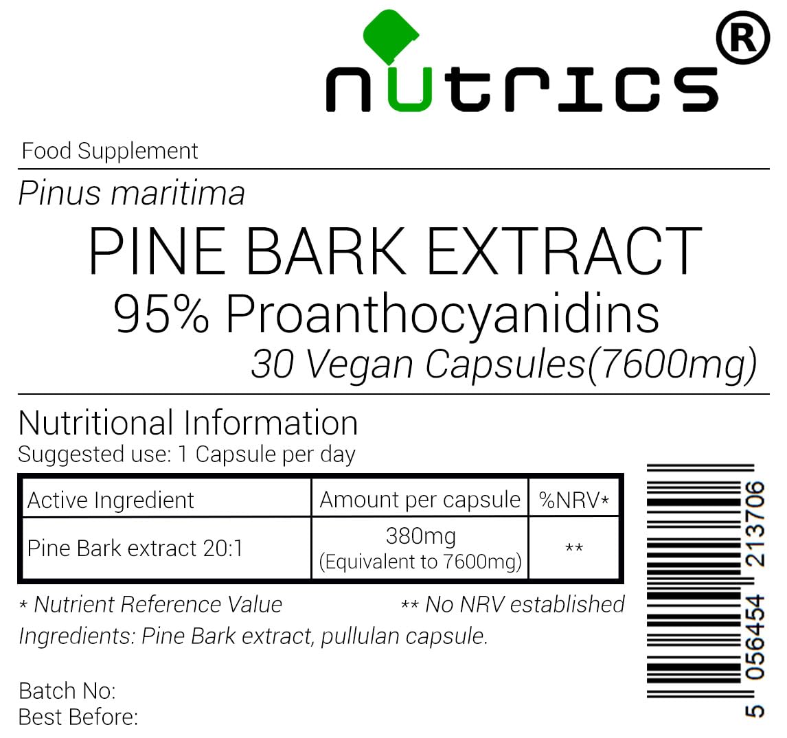 Nutrics® 7600mg French Maritime Pine BARK Extract 95% Proanthocyanidins 100% Pure 30 V Capsules (1 Month Supply) - Suitable for Vegan Vegetarian Halal Kosher (30)