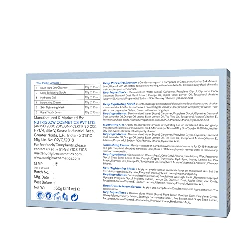 A good skincare routine is only as good as the products you use! With the goodness of Glow-Boosting antioxidants, NutriGlow NATURAL'S Advanced Skin Whitening Facial Kit packed with an Instant Lightening Cleansing Gel, Dark Spot Reduction Gel Scrub, Flawless Radiant Vitamin C Serum, Melanin Reduction Nourishing Creme, Brightening & Tightening Cream Mask made from Papaya Extracts, Alpha Arbutin, Vitamin C to name a few that perfectly balances skin radiance, excess facial oil & brings out the best out of you. This premium range facial kit from NutriGlow NATURAL'S Cosmetics safeguards skin from sun damage, free radicals, stubborn tan, signs of ageing & brightens the dark skin complexion that makes you look splendorous effortlessly. Benefits: 1. THIS FACIAL KIT CONTAINS: 1) Deep cleanser 10gm 2) Exfoliating scrub 10 gm 3) Nourishing gel 10 gm 4) Whitening cream 10 gm 5) Mask pack 10 gm 6) Serum: 10-ml 2. FORMULATED WITH ANTI-AGEING & SKIN LIGHTENING PROPERTIES: Our facial kit is prepared with extracts of alpha arbutin that helps in lightening the uneven skin tone & improves the radiance of the dormant skin naturally. The papaya fruit extracts in this allow the skin to fight visible signs of ageing & fine lines making you what you always desired for. 3. REMOVES ACNE, BLACKHEADS PERFECTLY: Blended with the purest form of natural ingredients this power-packed facial kit comes with the unique combination of skin lightening cleansing gel & dark spot reduction gel scrub to firmly remove acne, blackheads & their side effects. It securely repairs skin breakage, open pores and strengthens skin tissues to guarantee natural texture & glow to your skin. 4. CALMS STRESSED & IRRITATED SKIN: In our day-to-day life, people cannot stop themselves from stepping out but unluckily sunburn and tanning do so much harm to our skin. Hence, taking care of it is crucial.More Info