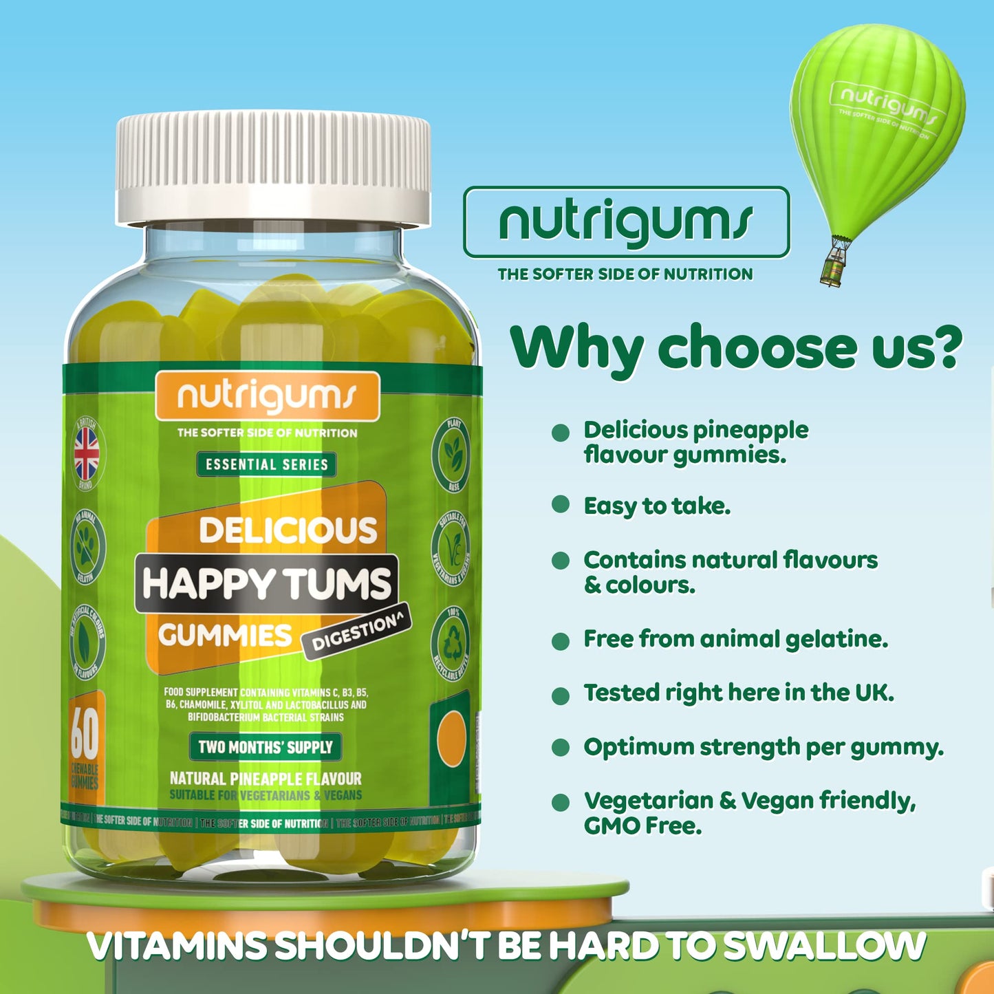 Nutrigums Happy TUMS Digestive Complex 60 Vegan Gummies. Pineapple Flavour. Gut Health with Probiotics 1.125 Billion CFU, Vitamins C, B3, B5, B6, Chamomile 1000mg and Xylitol. Two Months’ Supply by NUTRIGUMS®
