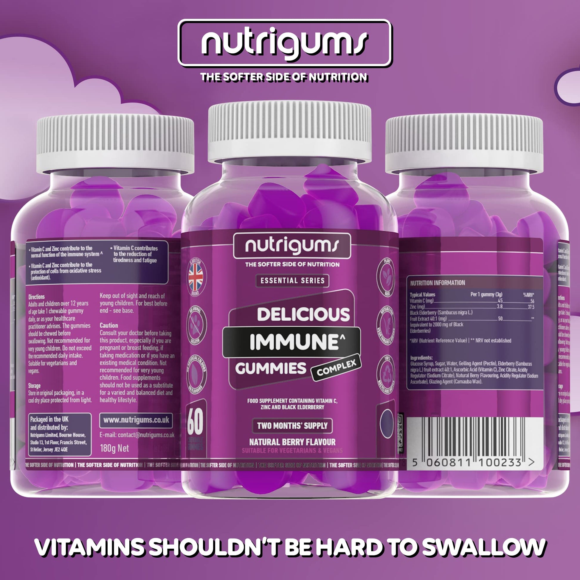 - IMMUNE SUPPORT - NUTRIGUMS Elderberry Complex provides a delicious and convenient way to include the superb qualities of Elderberry fruit extract along with permitted immune defence nutrients Zinc and Vitamin C.