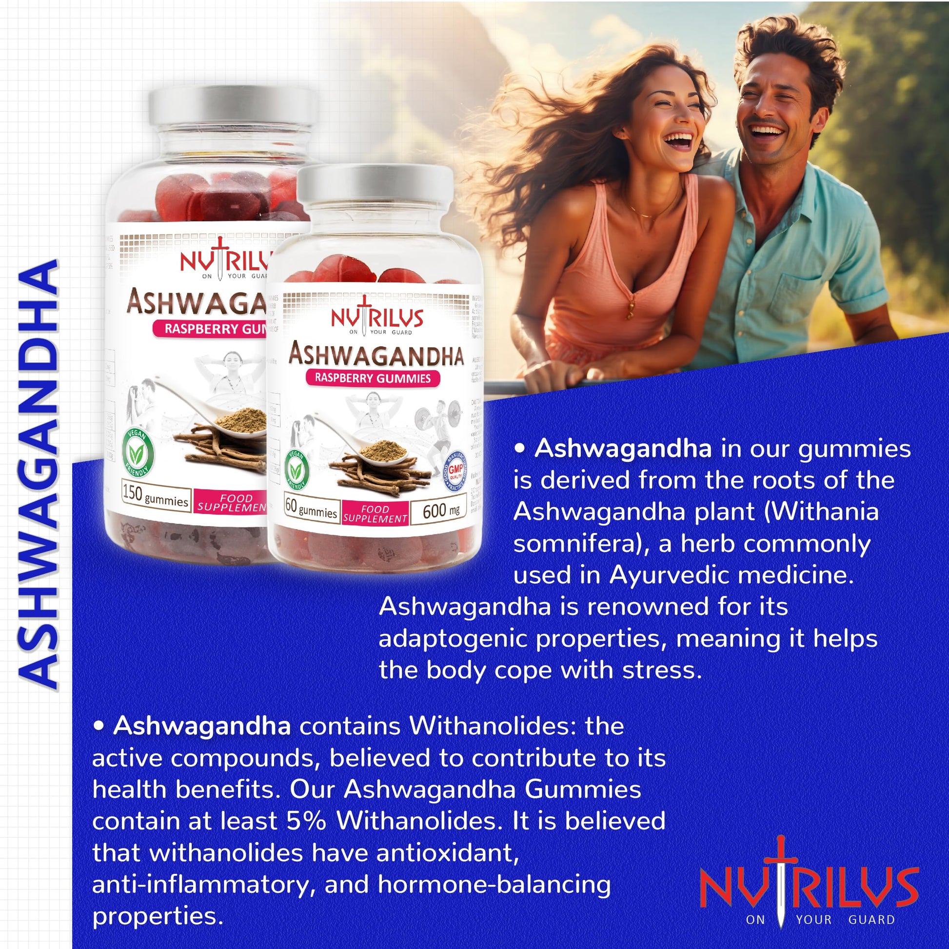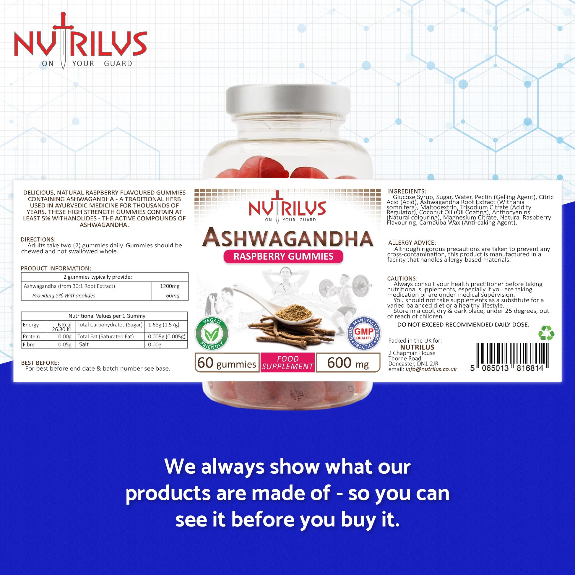 Nutrilus Ashwagandha Root Extract Gummies 600mg – 1200mg per Serving - High Strength – 5% Withanolides – Natural Flavour Vegan Gummy Supplement (60 Gummies)
