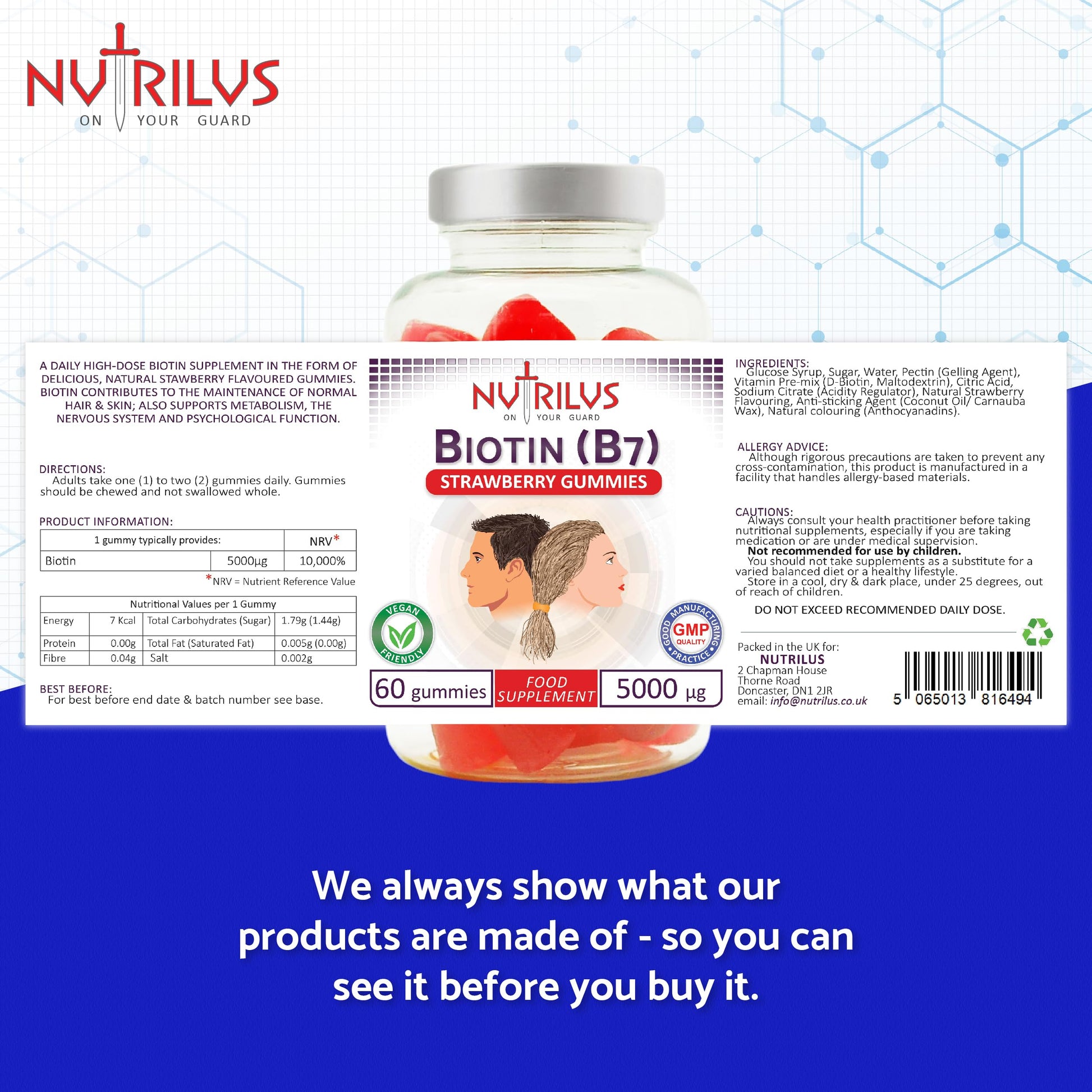 Nutrilus Biotin 60 Natural Strawberry Gummies High Strength 5000mcg per Gummy - One Daily - High Dose Vegan Supplement 5000µg Vitamin B7 - Hair & Skin & Nails