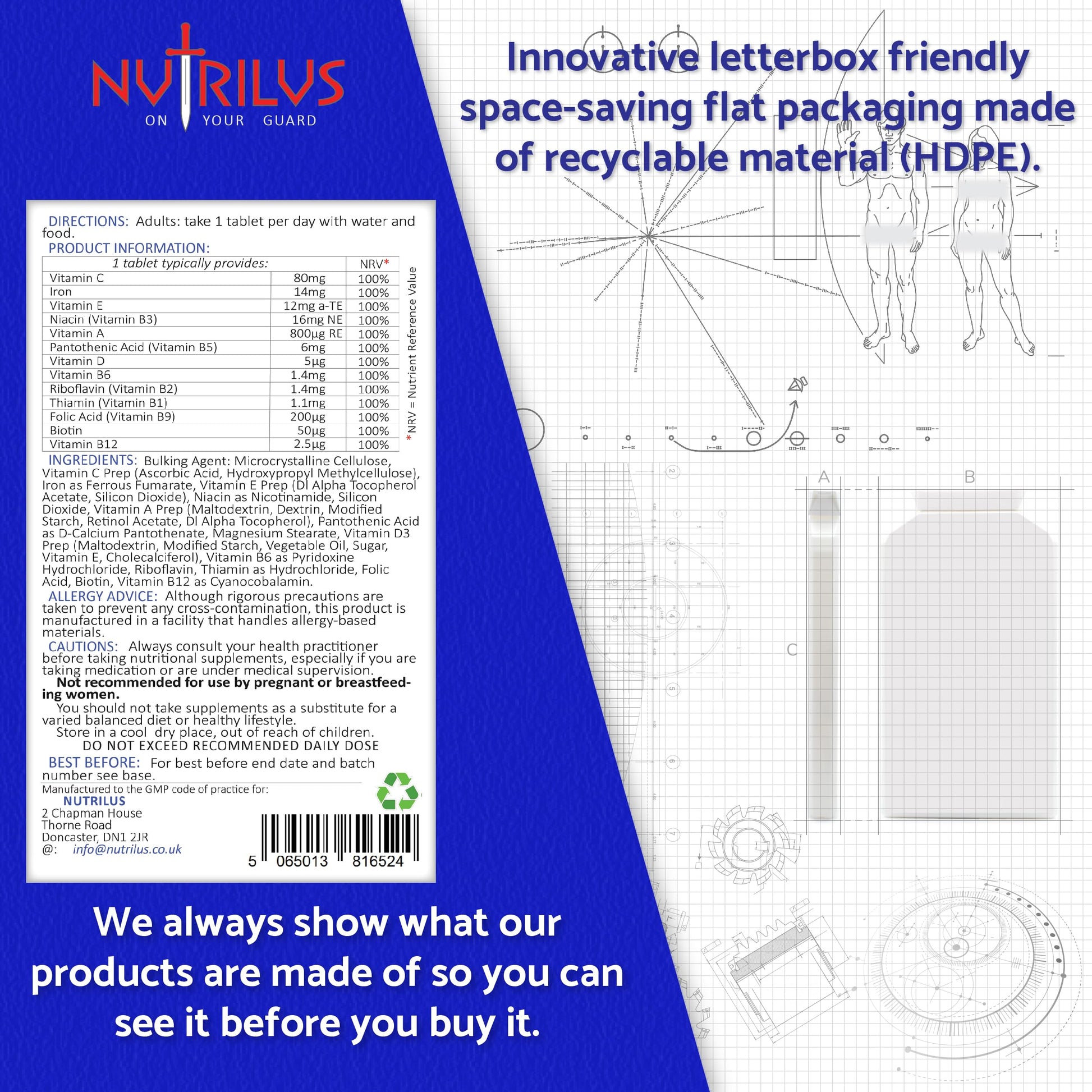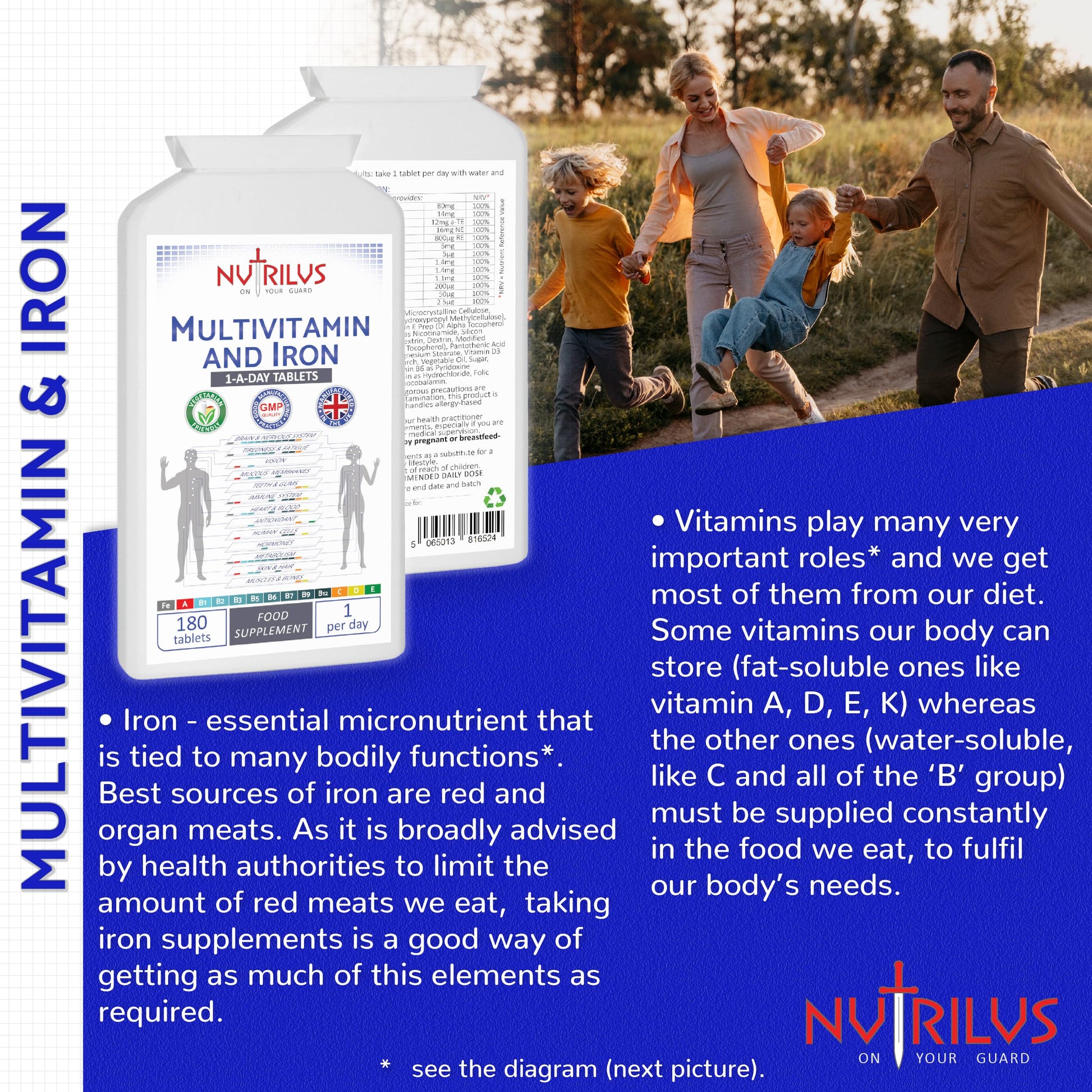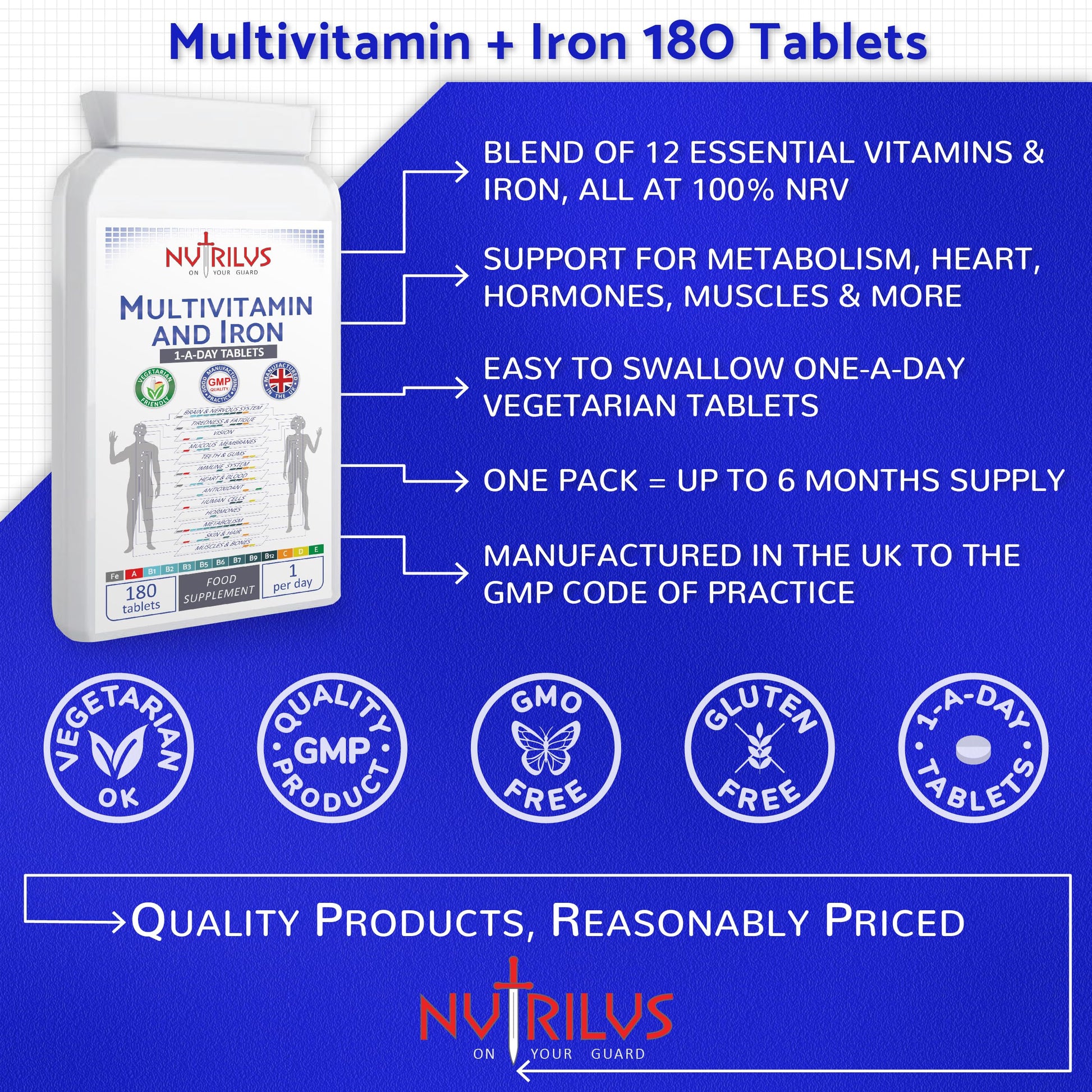 180 One-a-Day Tablets with 12 Vitamins + Iron at 100% NRV. Made in UK.