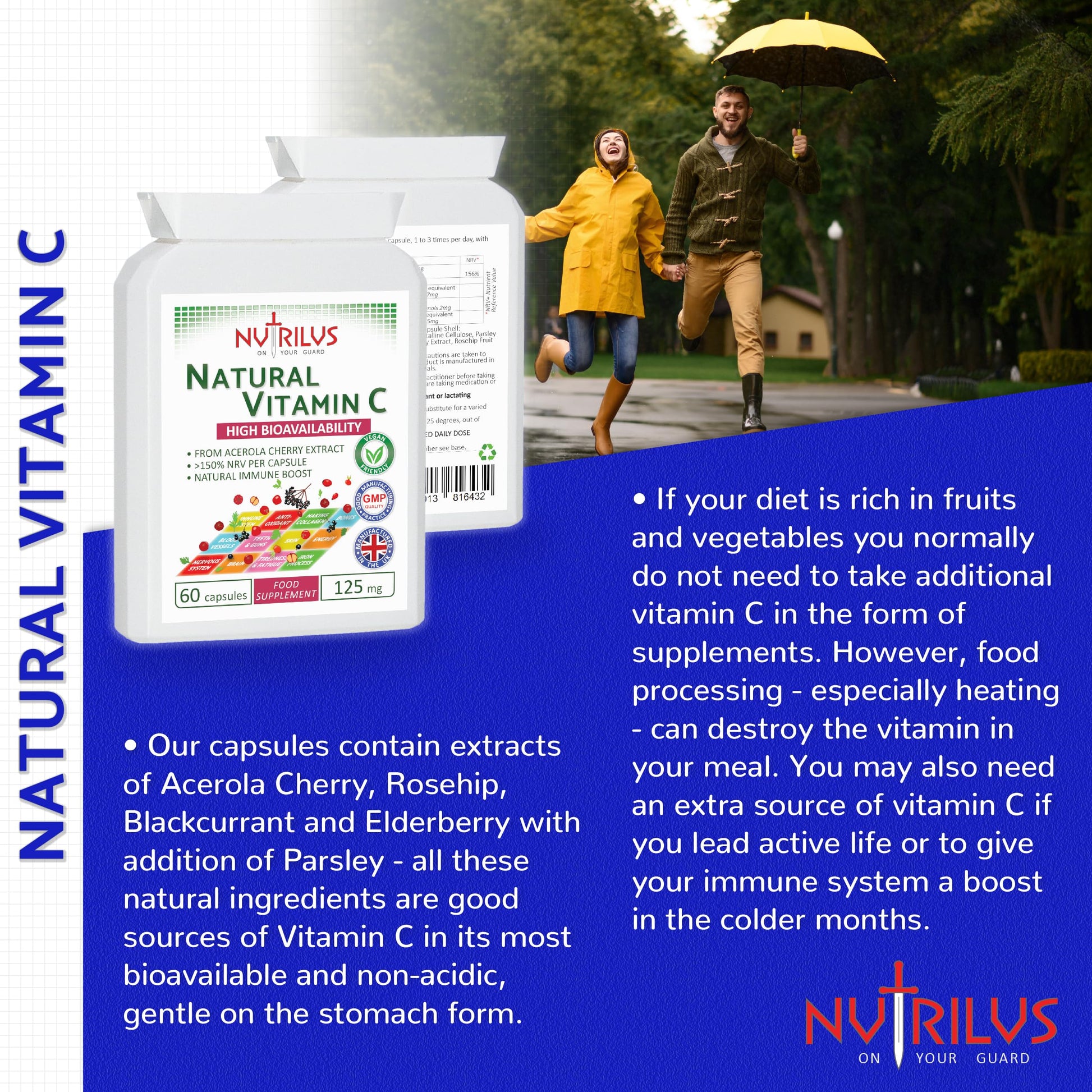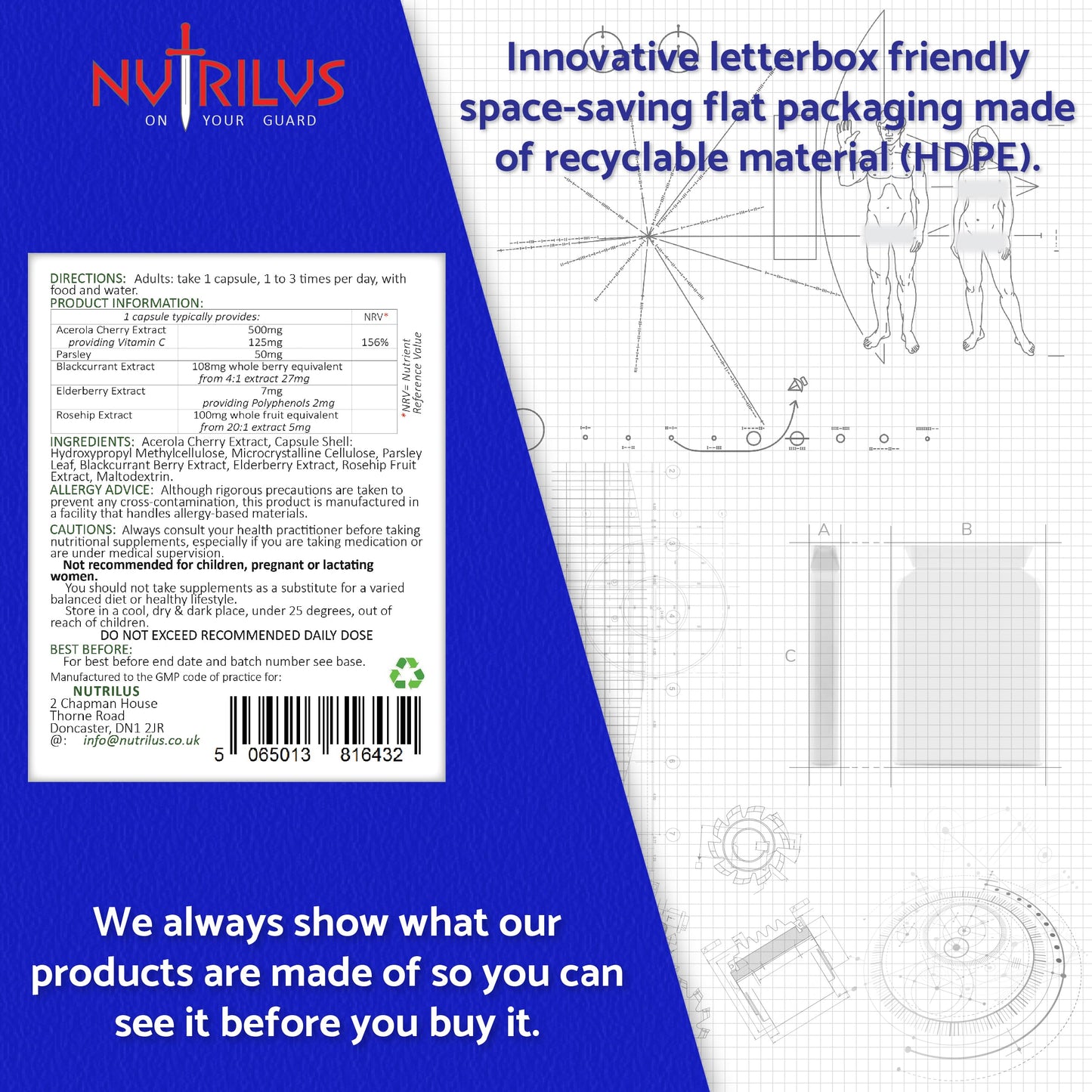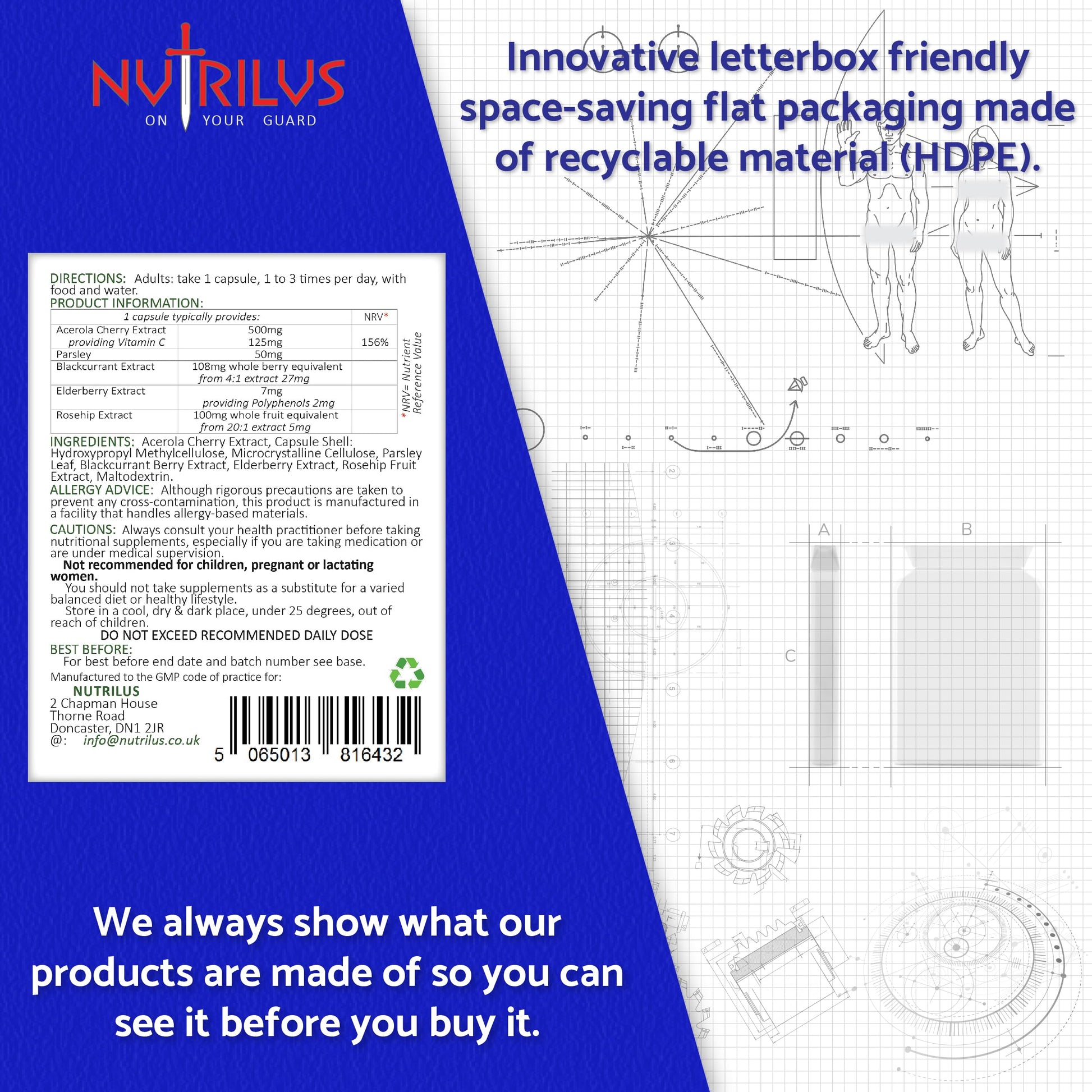 Our capsules contain natural (not lab-made) Vitamin C extracted from one if its richest sources: Acerola Cherry Fruit, with added Parsley, Blackcurrant, Elderberry and Rosehip. This gives you a gentler, more easily absorbable and more bioavailable form of the vitamin than the usual, common, synthetic one.