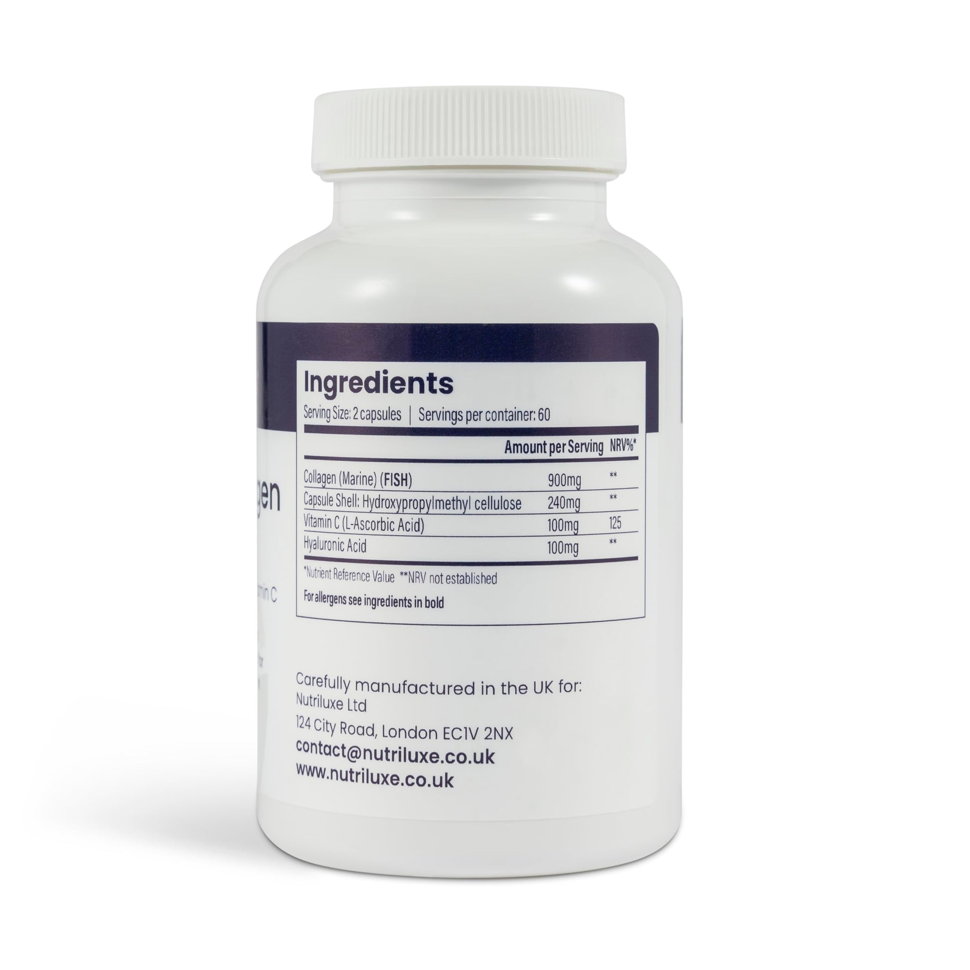 Manufactured in the UK, Nutriluxe Marine Collagen with Hyaluronic Acid and Vit C capsules are free from unnecessary fillers and artificial additives. Every capsule is crafted to meet the highest standards of purity and safety, ensuring that you receive maximum benefits in each dose.