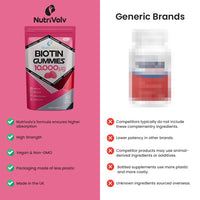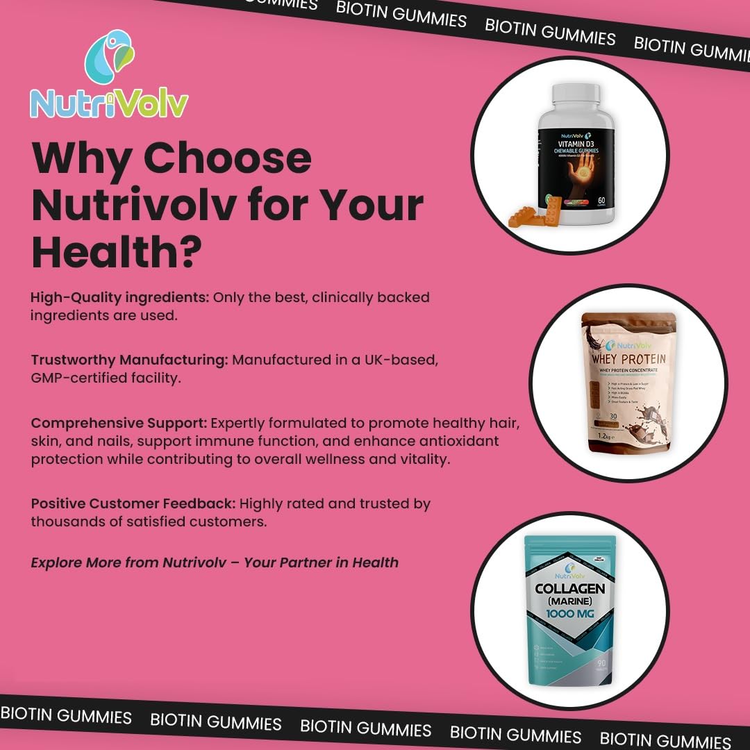 NutriVolv Biotin 10,000mcg Gummies offer a convenient and tasty way to support your daily beauty and wellness routine. Formulated to help maintain the health of your hair, skin and nails, each pack contains 60 delicious gummies—providing a full two-month supply with a simple one-a-day dose. These high-strength biotin gummies are perfect for both men and women looking for an easy-to-take supplement that fits into any lifestyle. With a fruity peach flavour and no harsh aftertaste, these biotin 10000mcg gummies are ideal for those who prefer chewable supplements over tablets or capsules.Biotin, also known as Vitamin B7, plays a key role in supporting normal energy-yielding metabolism and contributes to the maintenance of healthy skin and hair. NutriVolv’s biotin supplement is made to high standards and is a popular choice for those seeking biotin gummies for hair growth, skin care and nail strength. NutriVolv provides a reliable, high-quality option to support your personal care goals.