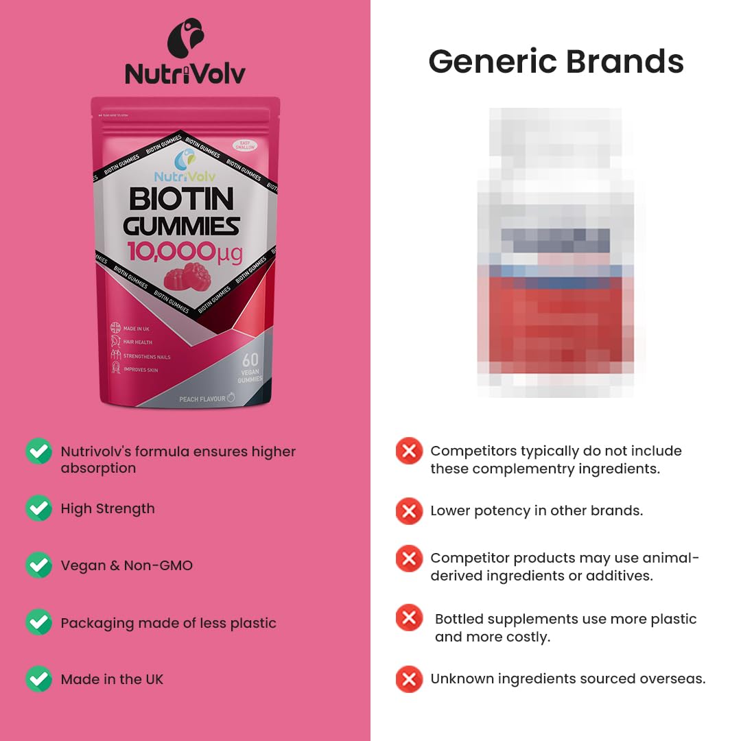 Nutrivolv Biotin Gummies 10,000mcg | 60 Vegan Gummies | 60 Day Supply | for Hair Growth & Skin & Nails Health | Natural Peach Flavour | Vitamin B7 Gummies | Gelatine Free | Sugar Free | Non-GMO | by NutriVolv