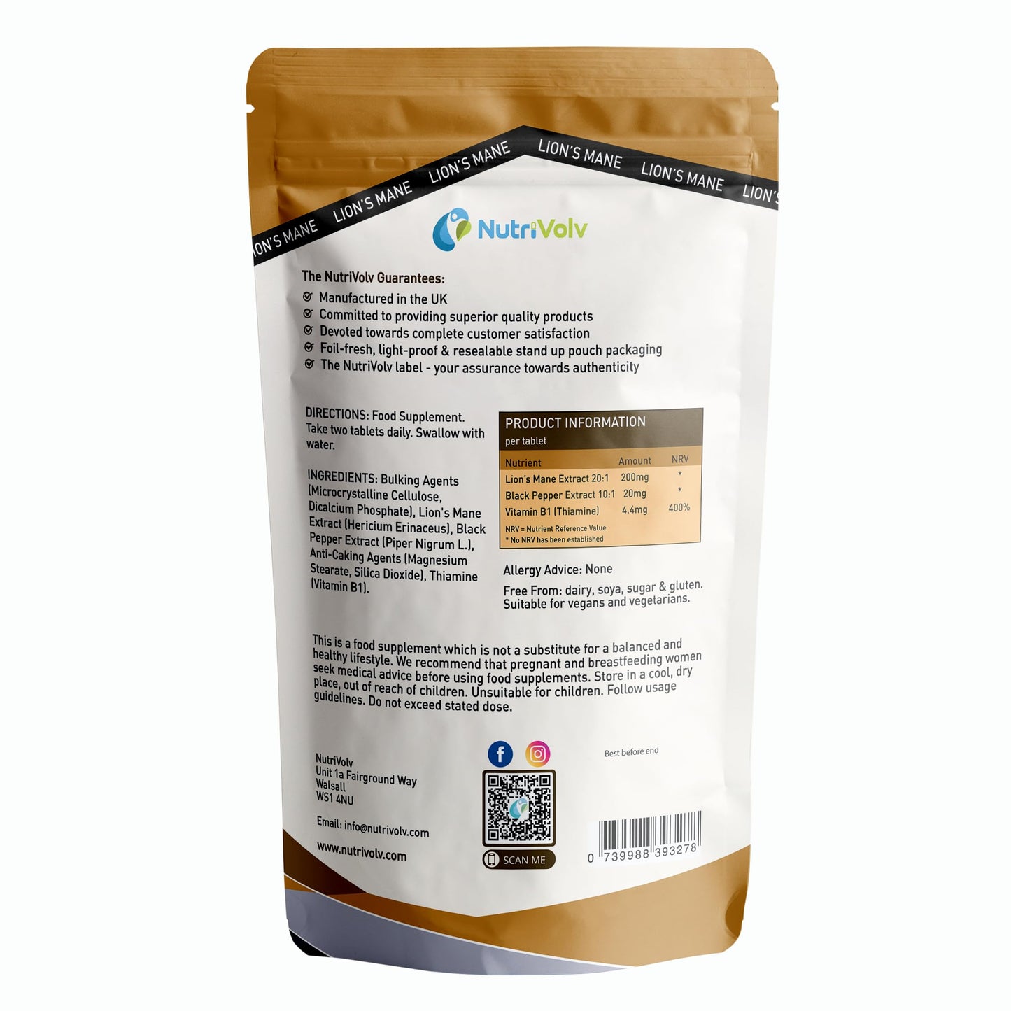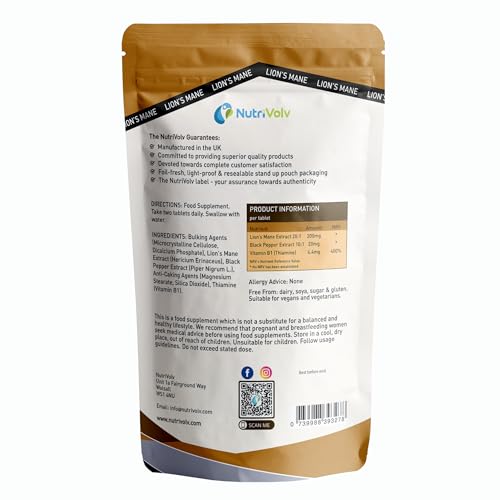 Introducing NutriVolv Lion's Mane 4000mg Tablets, an advanced cognitive support supplement enriched with Vitamin B1 and Black Pepper Extract to enhance its effectiveness. With a generous 180 tablets per pouch, this three-month supply combines the powerful benefits of Lion's Mane mushroom with essential nutrients to elevate your mental clarity, memory, and overall wellbeing. Perfectly designed for anyone looking to unlock their full potential, this premium blend offers comprehensive support for brain and body health.Lion's Mane is a renowned natural nootropic celebrated for its ability to promote cognitive function, enhance focus, and support long-term brain health. The addition of Vitamin B1 amplifies these benefits by supporting energy production, boosting nervous system health, and reducing fatigue. This combination ensures you stay energised and mentally sharp throughout the day, making it ideal for students, professionals, and those looking to maintain brain health as they age.