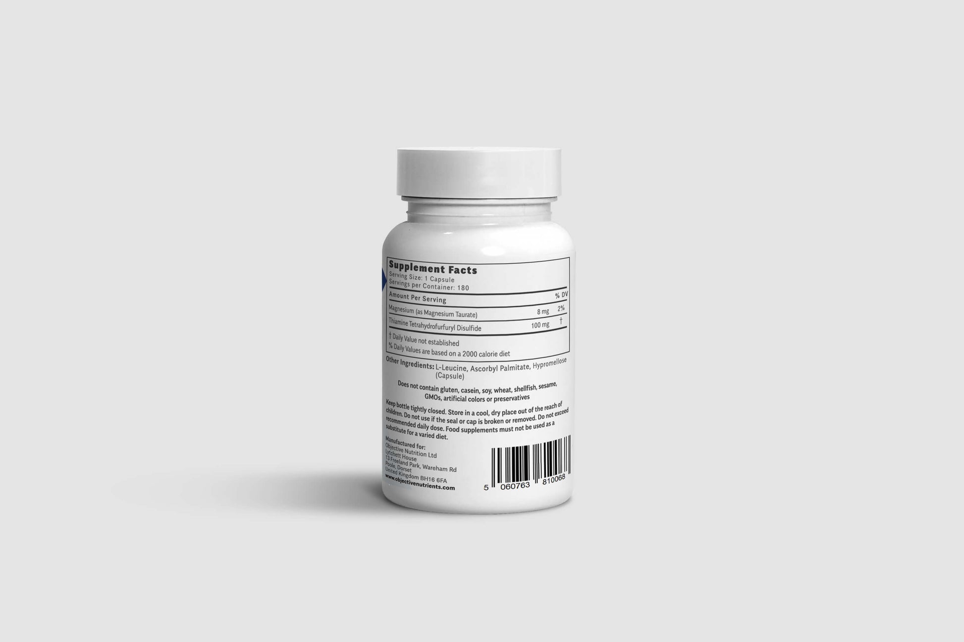 Thiamax contains thiamine tetrahydrofurfuryl disulfide, a derivative of thiamine (vitamin B1) with high bioavailability. This form has been shown to cross the blood-brain-barrier and can bypass normal routes of thiamine absorption, with a higher rate of uptake both in the gut and at the cellular level. Thiamax also includes a small amount of magnesium (as magnesium taurate), which plays an important role in supporting how cells can use thiamine.