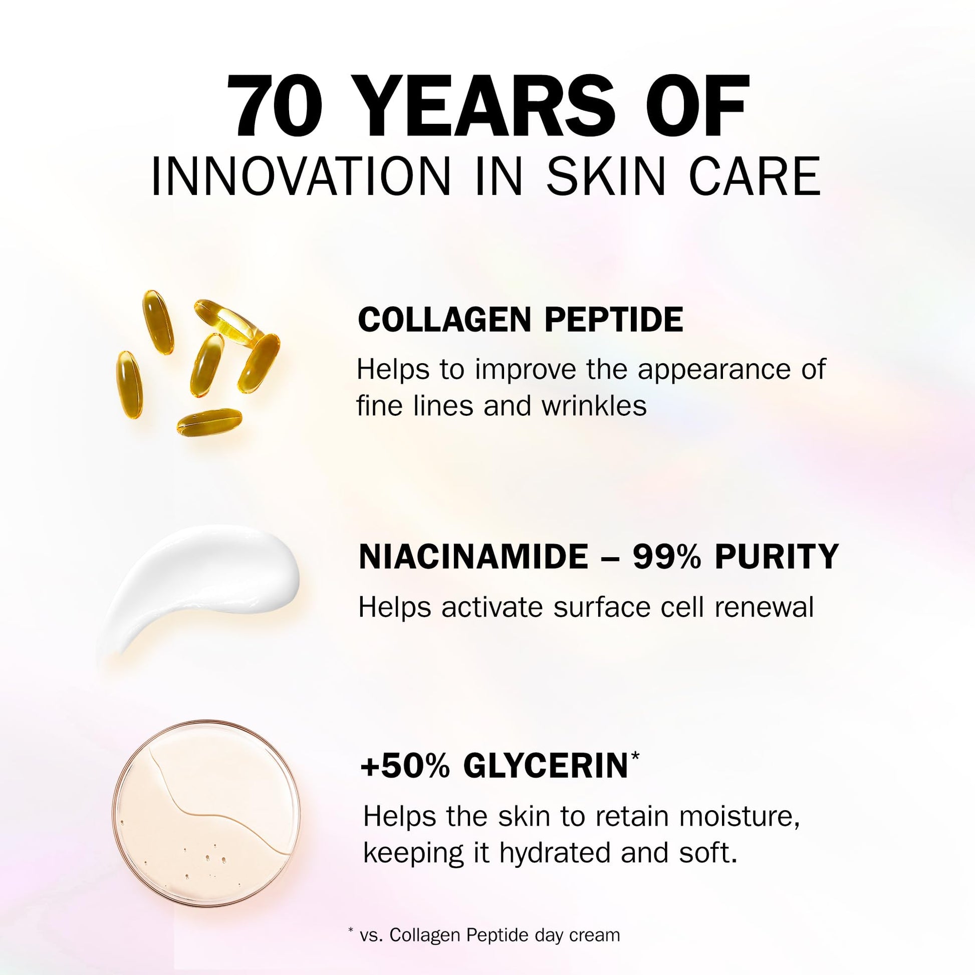- Supercharged with Collagen Peptide, that helps improve the appearance of fine lines and wrinkle, 99% pure Niacinamide and +50% hydrating ingredients