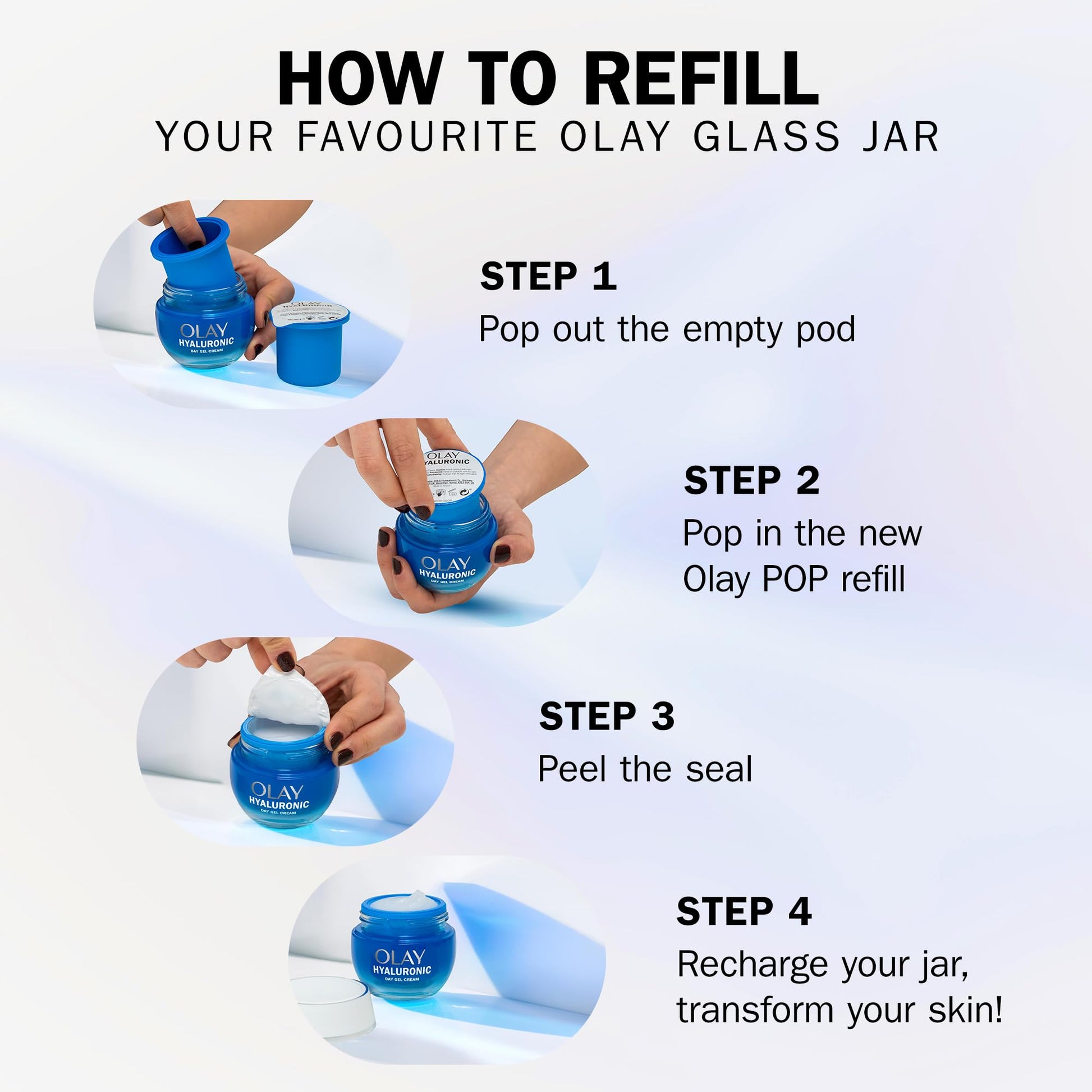 - Olay POP refill, the first Olay’s effortless refill system: keep your empty jar and pop in an Olay POP refill