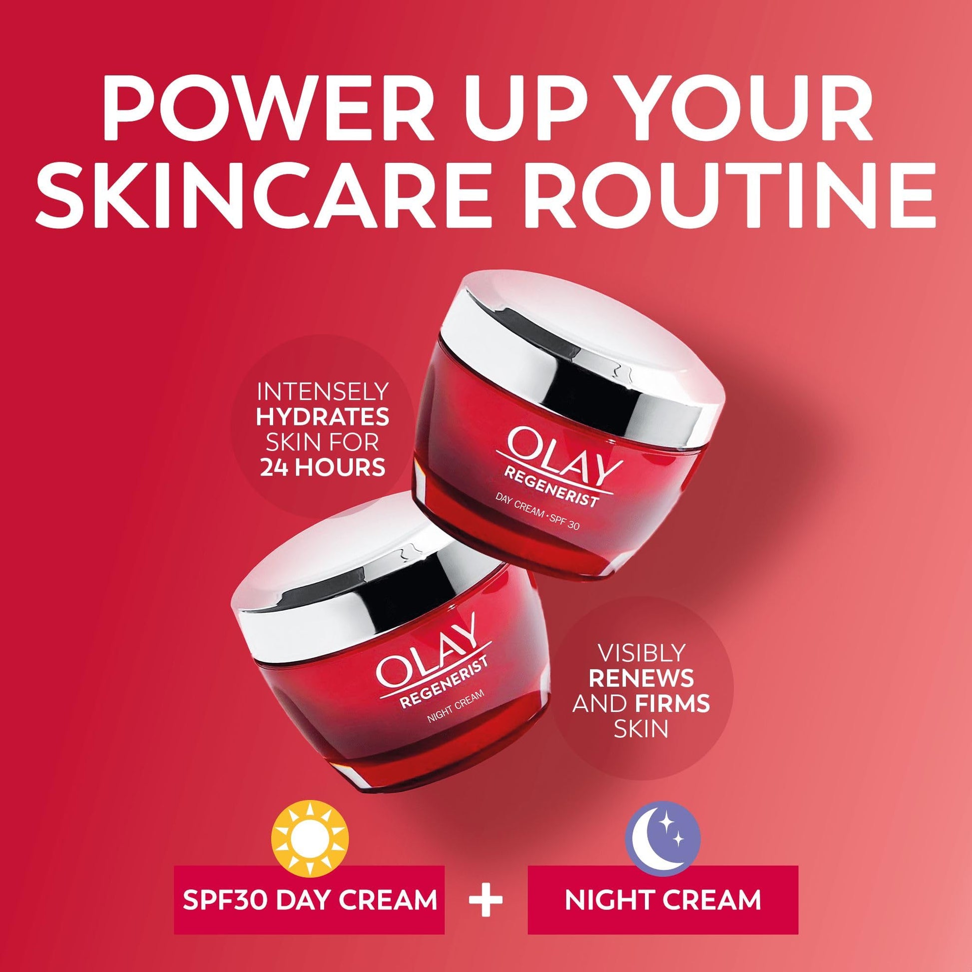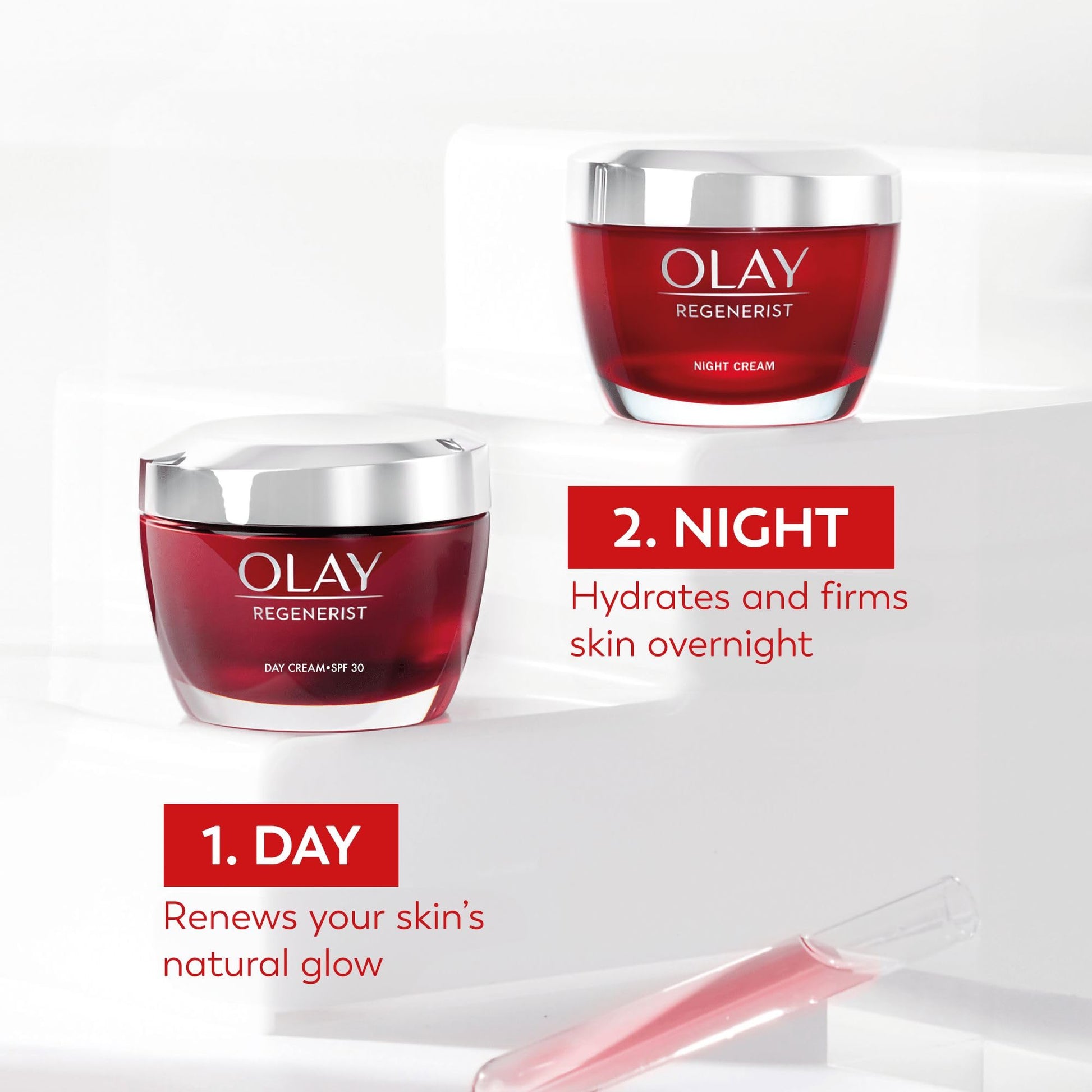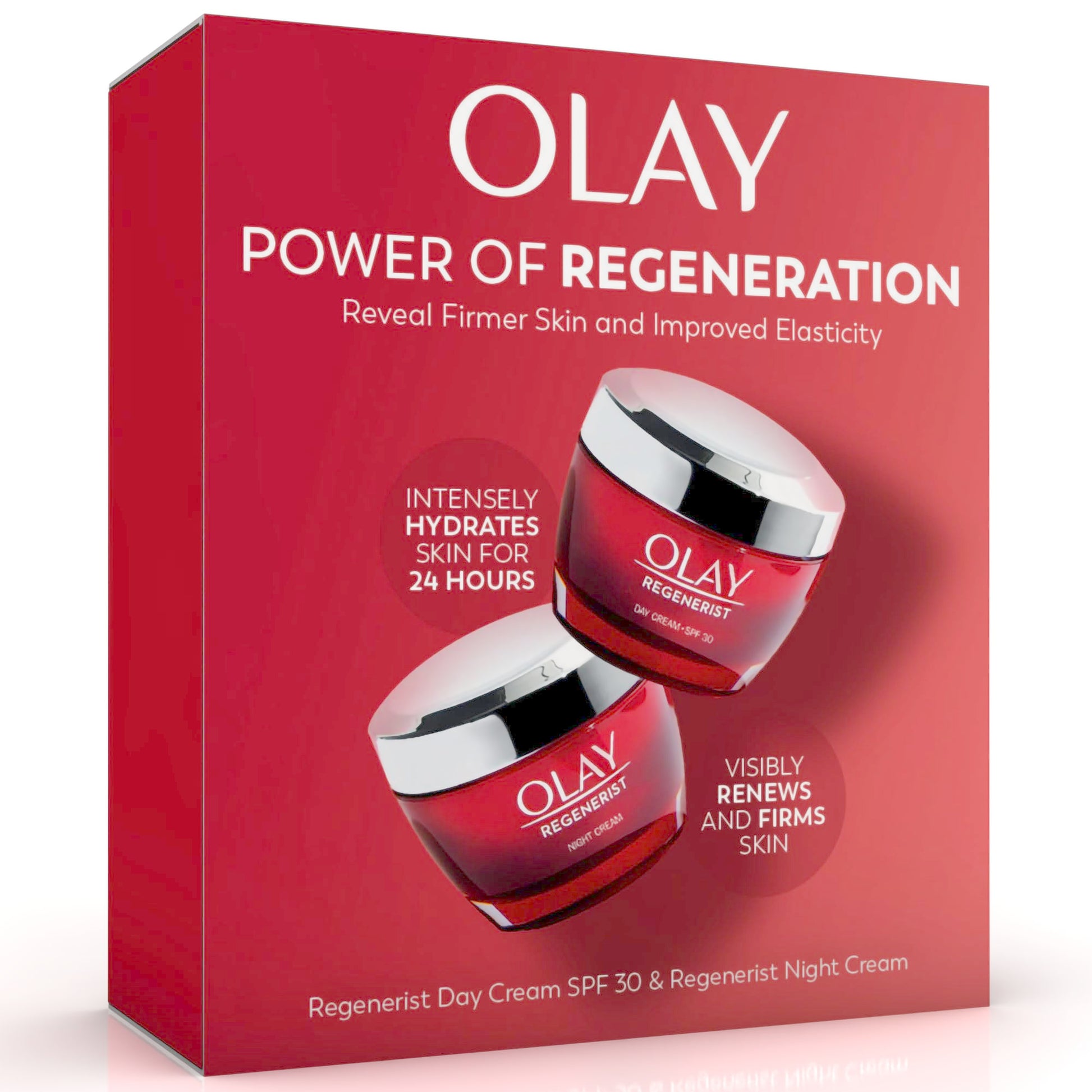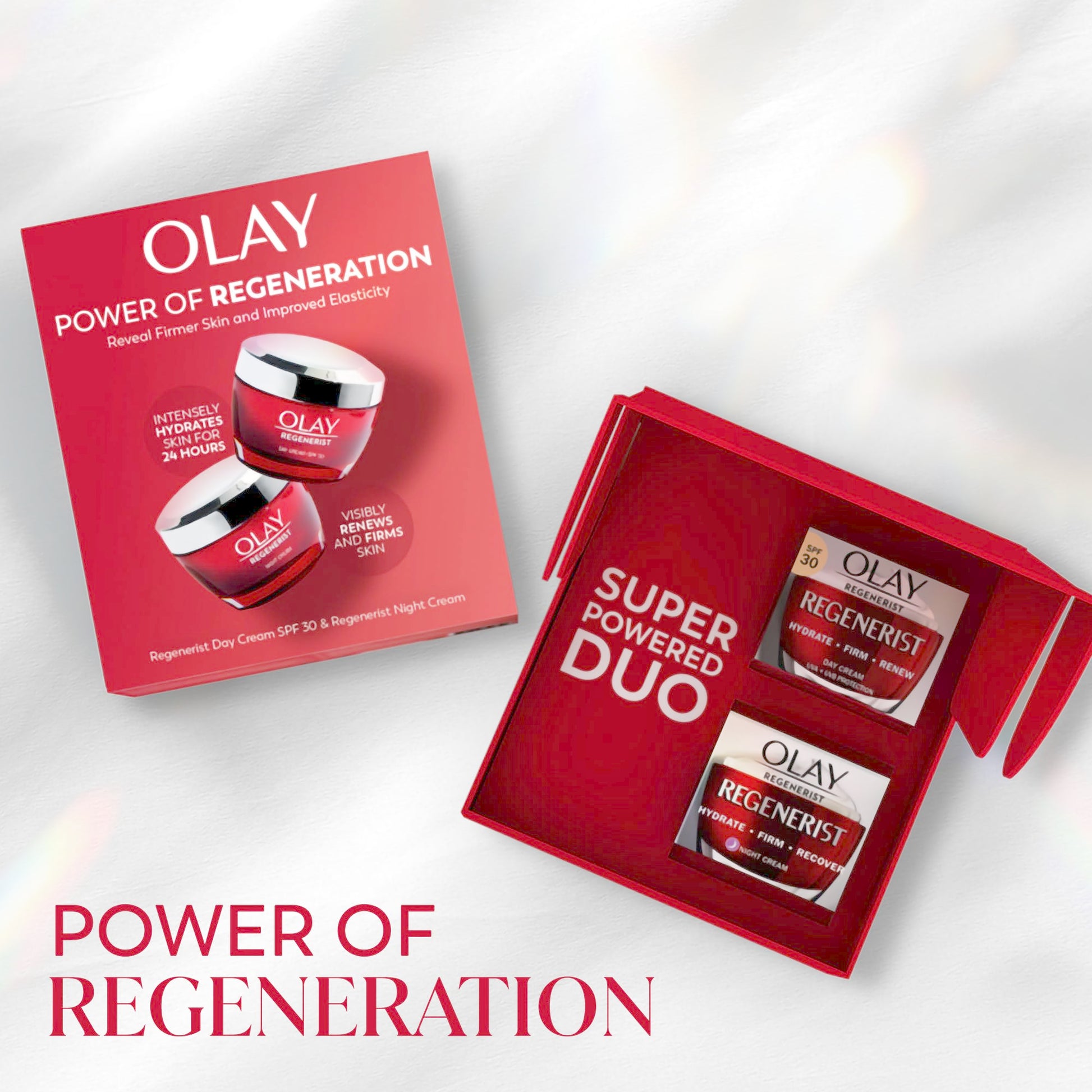 - Introducing the Olay Power Regeneration Giftset: Regenerist SPF 30 Day Cream + Regenerist Night Cream, This powerful duo is designed to reveal firmer skin and improved elasticity