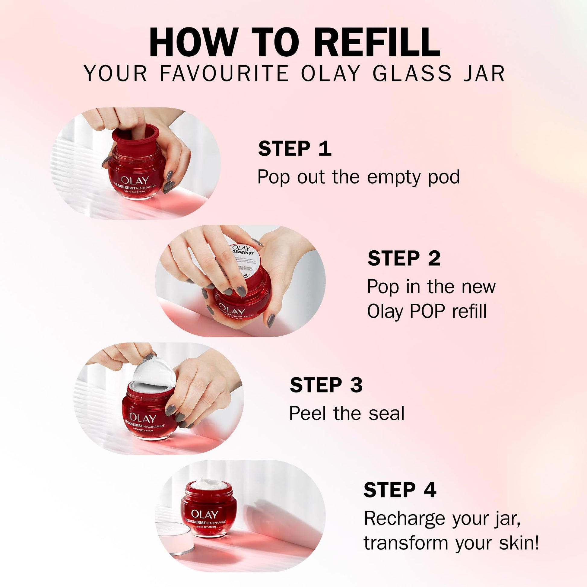 - Olay POP refill, the first Olay’s effortless refill system: keep your empty jar and pop in an Olay POP refill
