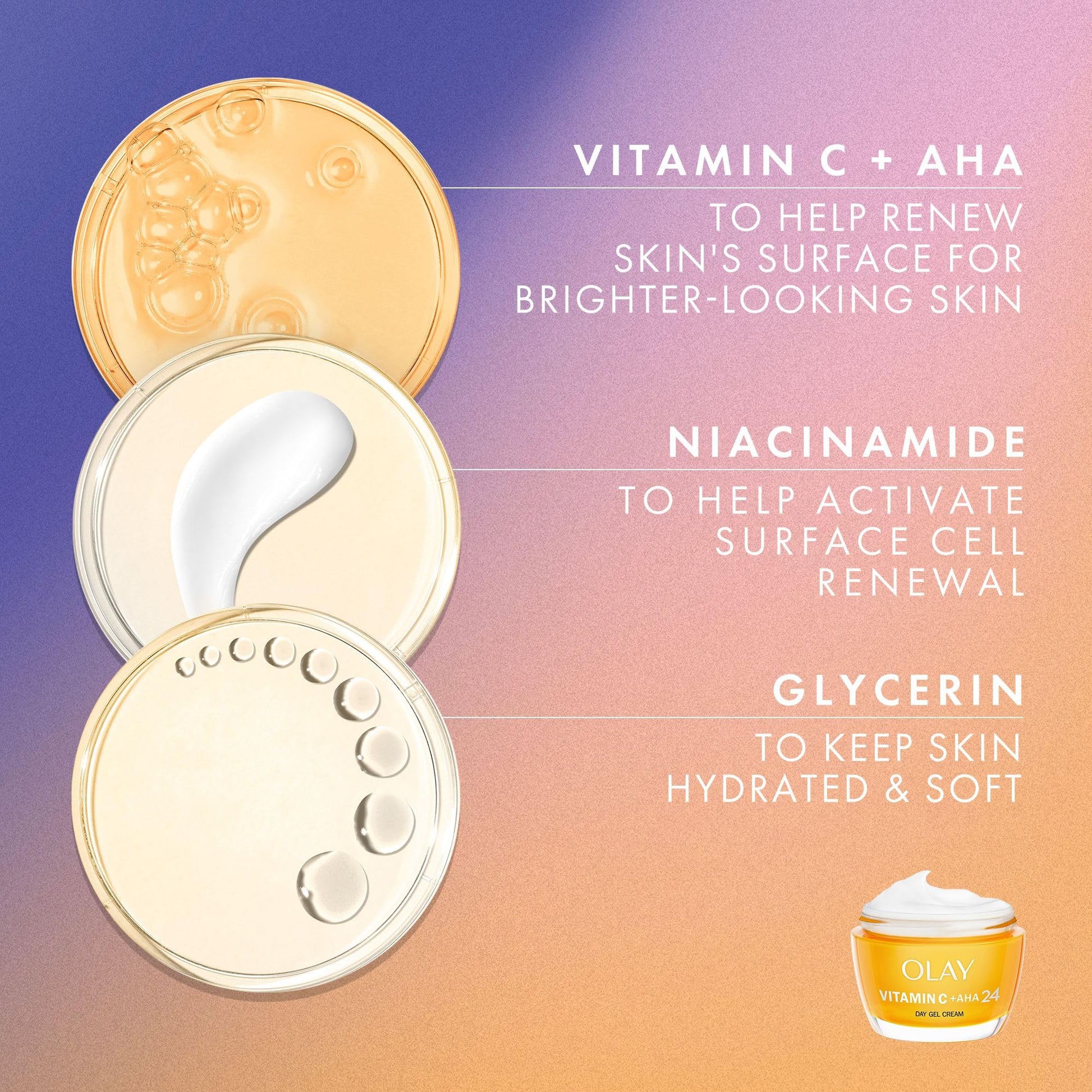 - Olay Regenerist Vitamin C + AHA Day Gel Cream delivers clearly brighter skin in 1 day & more even skin tone in 14 days
