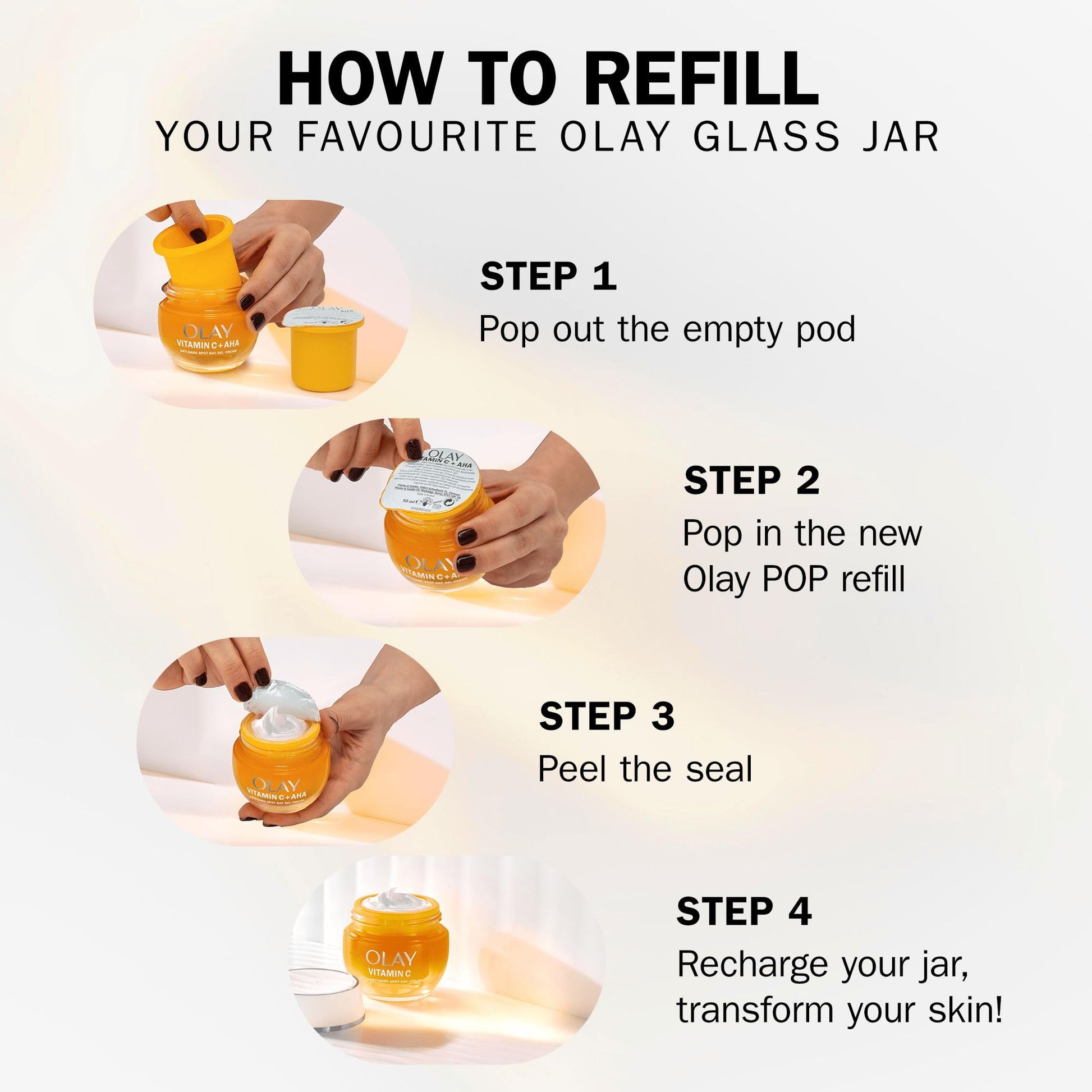 - Olay POP refill, the first Olay’s effortless refill system: keep your empty jar and pop in an Olay POP refill