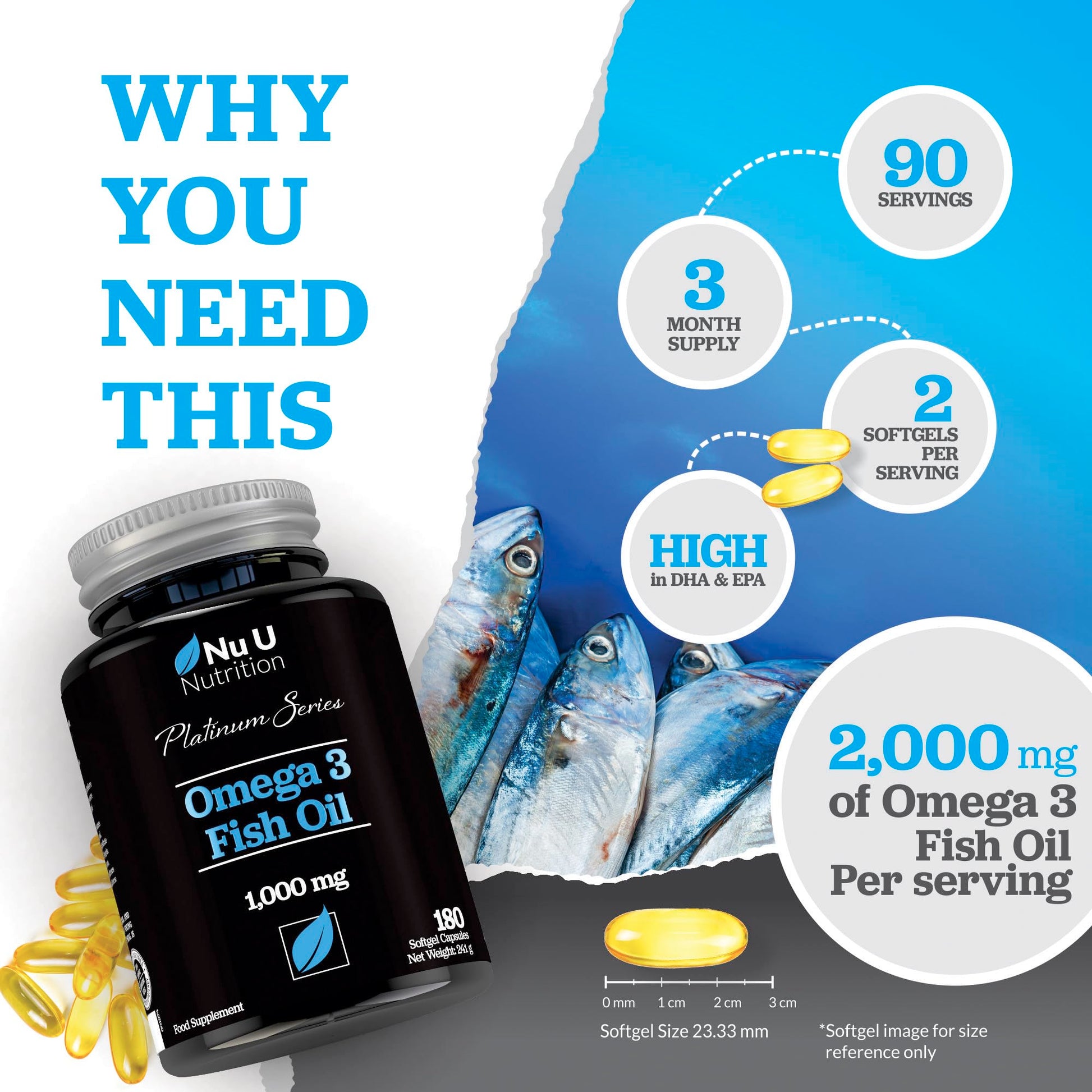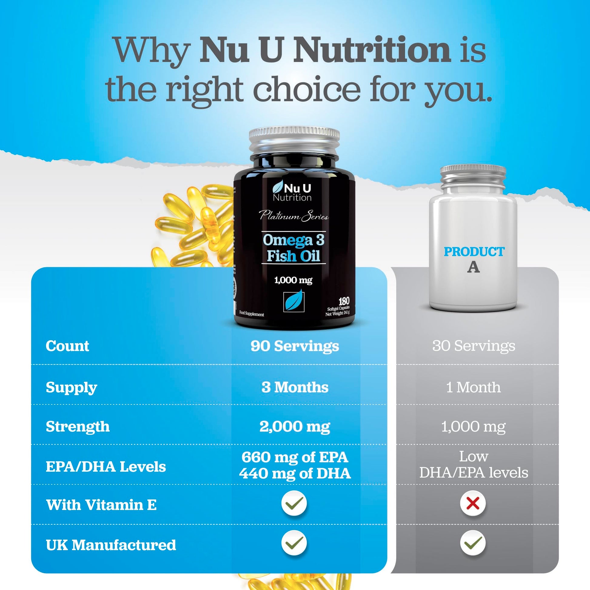 Product description: Why Take Omega 3? The health benefits of Omega 3 fatty acids are well documented. Unfortunately, the human body is not able to produce these essential fatty acids itself. It is instead reliant on you eating a diet rich in oily fish to gain them. Some of us might not always find this possible or like the taste of fish which is why Omega 3 is an essential supplement to add to your daily routine. Omega 3 is rich in EPA and DHA which contributes to the normal function of the heart and supports normal vision and brain function. Our super strength Omega 3 Softgels contain an impressive 330mg EPA (eicosapentaenoic acid) and 220mg DHA (docosahexaenoic acid) per softgel! Our proprietary formula also combines the fish oil with Vitamin E to ensure you receive the oil’s full potency. We have developed a 1.5:1 EPA and DHA ratio softgel which is the optimal ratio recommended by many healthcare specialists. It is also said to be the most effective in terms of promoting the wide range of benefits that Omega 3 supplementation can offer.Why Buy Nu U Platinum Series Omega 3? SUPERIOR STRENGTH - One Platinum Series softgel contains 150mg more EPA and 100mg more DHA than our traditional Omega 3 softgel supplements.FREE FROM ALLERGENS & ADDITIVES - For increased peace of mind, our Omega 3 softgels contain no harmful additives and are free from gluten, lactose, soya, eggs, crustaceans and nuts.NO RISK - No questions asked, feel the benefit. We want you to be satisfied with all of our products. UK PRODUCED - Produced to the highest manufacturing standards in the world in GMP facilities. Our whole process is in the UK from making the supplement to packing it, giving you the ultimate peace of mind.More Info