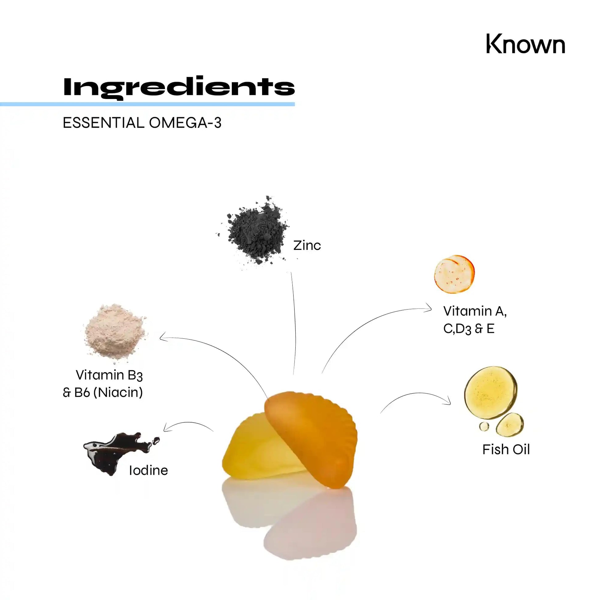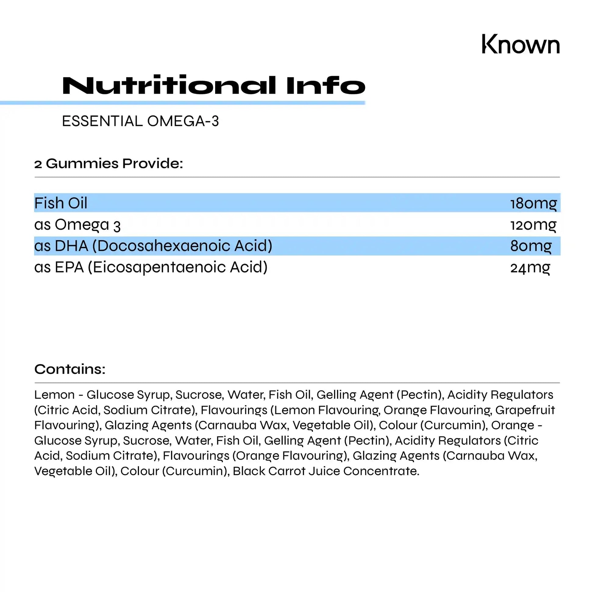Getting your daily Omega 3 just got a lot more delicious and a whole lot easier. Omega-3 is called an essential fat for a reason. It makes up crucial parts of cell membranes in our body. You have to get Omega 3 from food or an Omega 3 supplement. Each serving of our premium grade Omega 3 Fish Oil Vitamin Gummies delivers high potency vital fatty acids. Containing EPA and DHA, the two most effective forms of Omega 3, our gummy supplements help contribute to the heart's normal function, , support normal blood pressure, and the maintenance of normal vision and brain function. And you get it all in a tasty Lemon and Orange flavoured Gummy. It is a simple but effective way to increase your Omega 3 intake. Known Nutrition Omega 3 Gummies have a great fruity taste, which makes them a delicious alternative to traditional Omega 3 supplements. Containing 180mg of Fish Oil per serving offering 120mg as Omega 3, 80mg as DHA and 24mg as EPA. Unlike other Omega 3 formats, there is no fishy taste, just refreshing Lemon and Orange flavour, free from artificial colours and flavours, preservatives and lactose.More Info