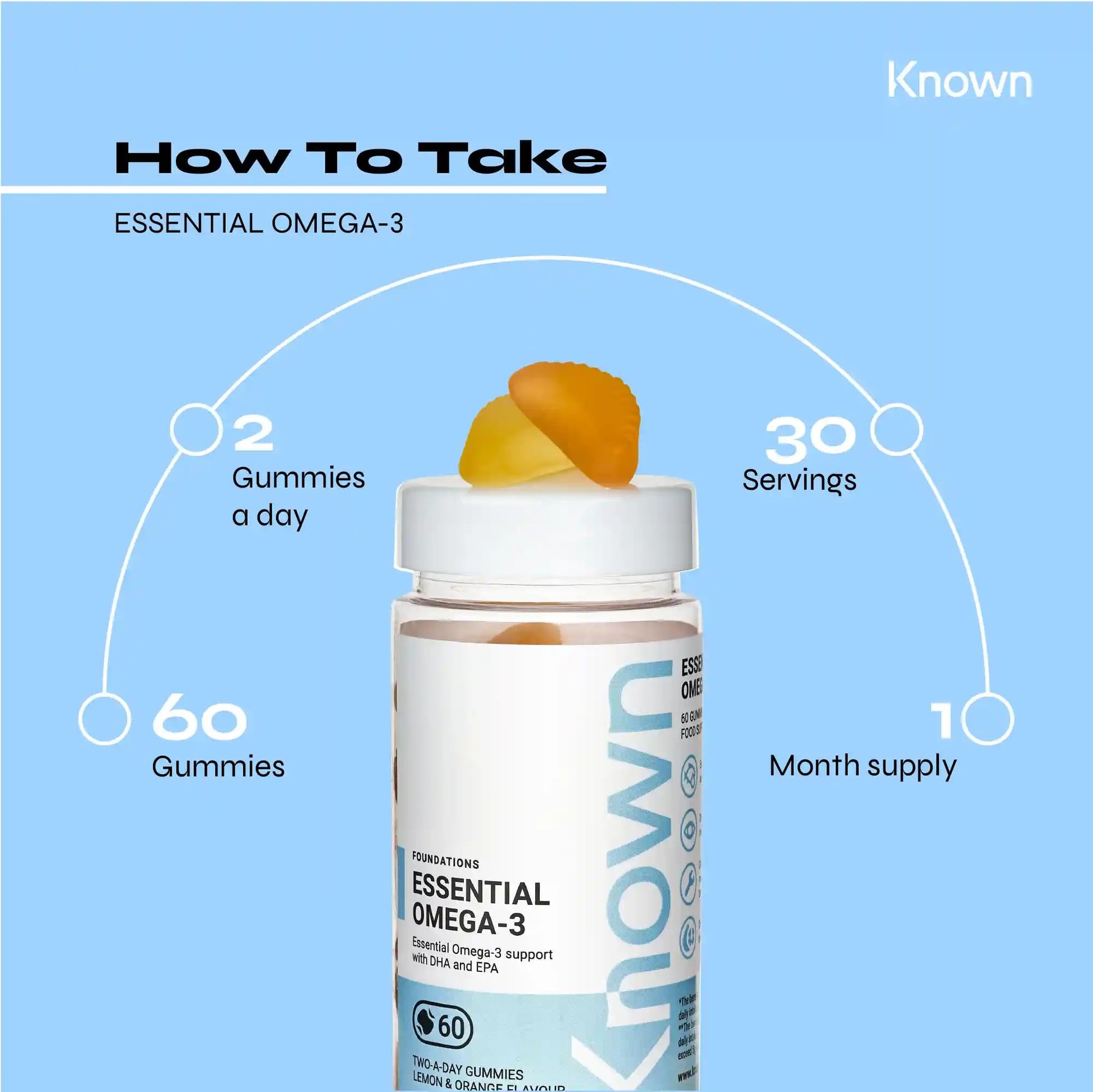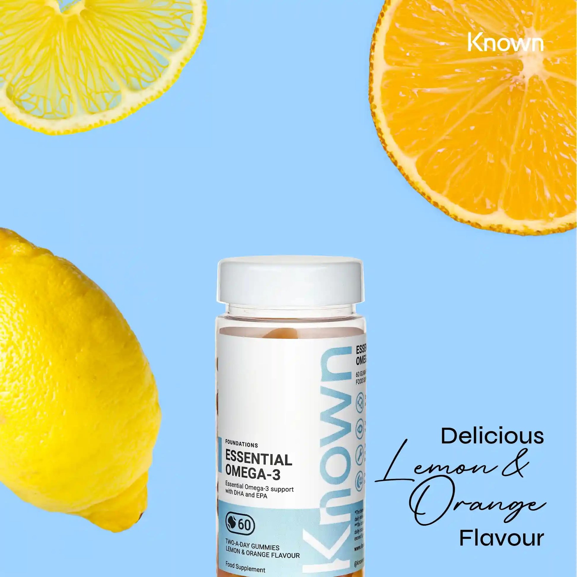 Omega 3 Vitamin Gummies by Known Nutrition with DHA & EPA | 60 Two-a-Day Omega 3 Gummies (One Month’s Supply) | Supports Heart, Brain & Eye Health | Lemon & Orange Flavoured Omega-3 (Pack of 1)