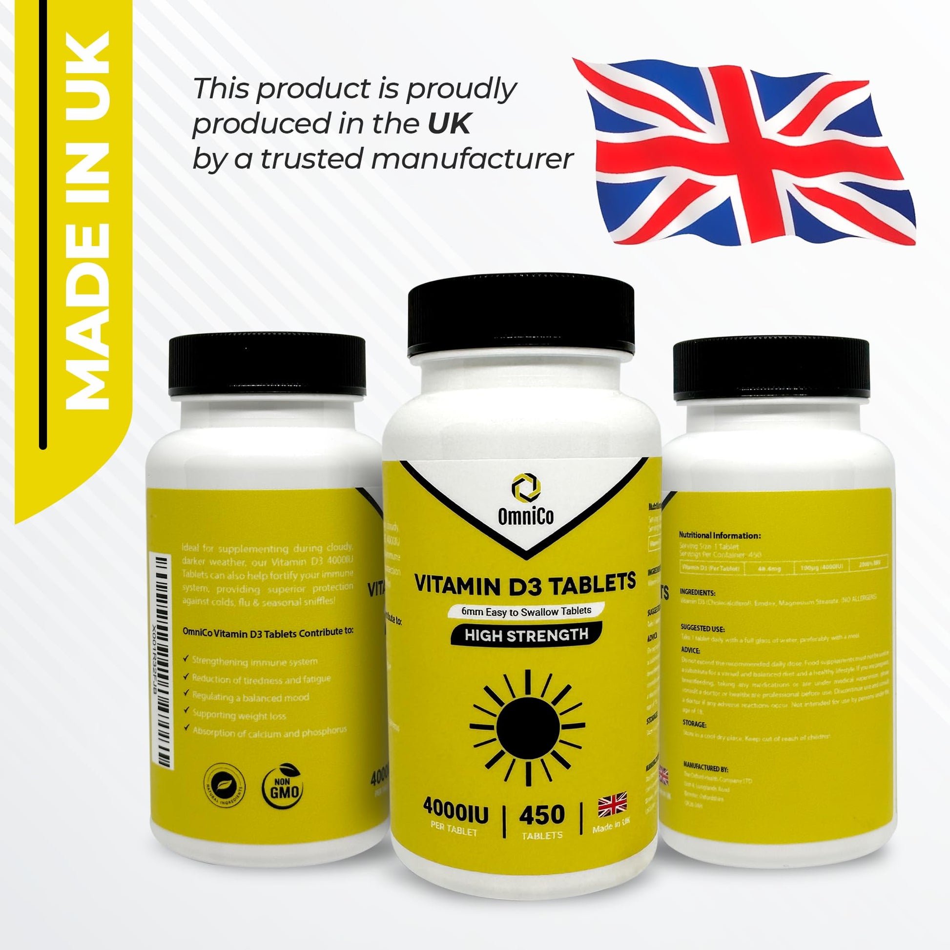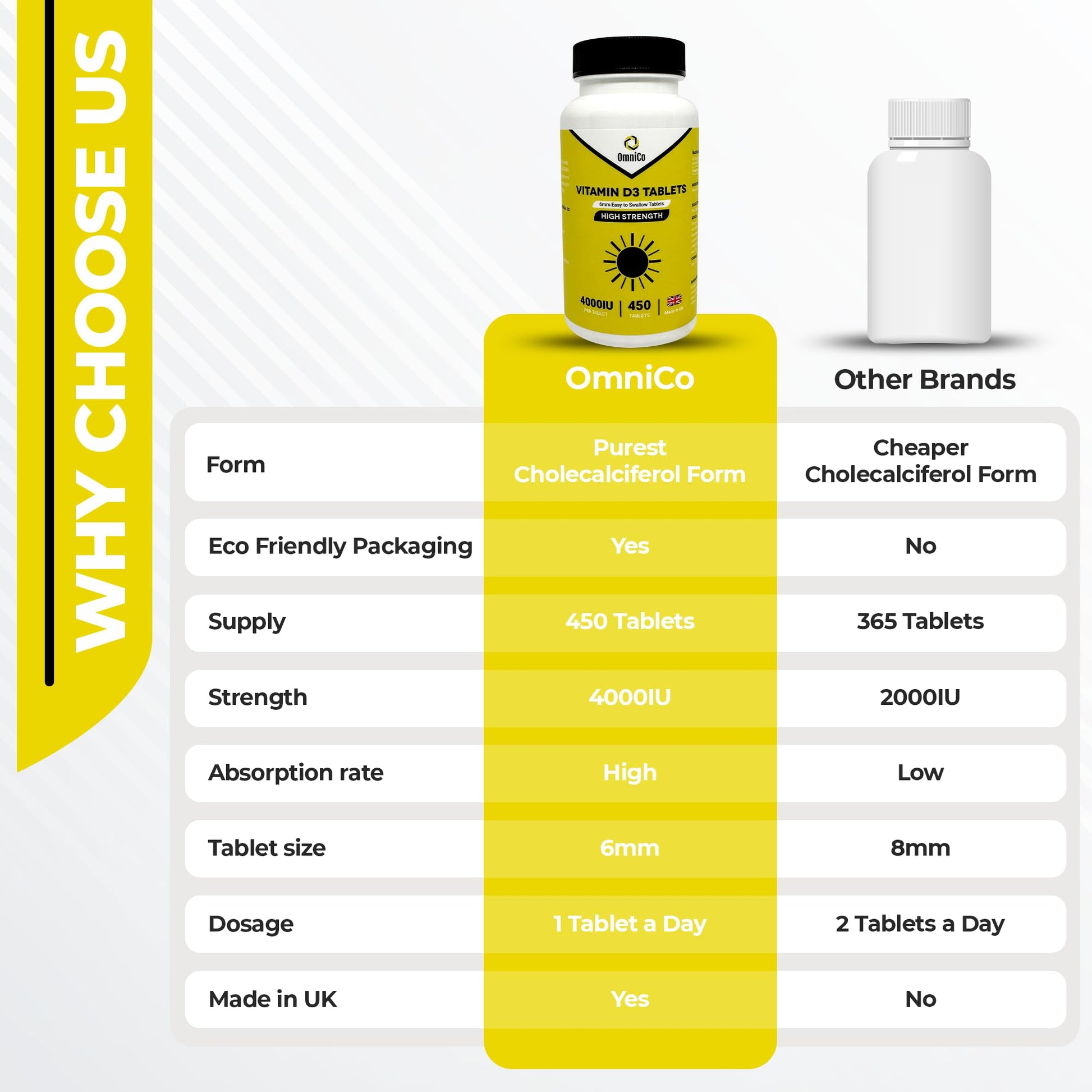 OmniCo Vitamin D3 Tablets - 4000IU - 450 High Strength 6mm Vegan Tablets – Easy to Swallow Micro Tablets for Mood & Energy - Vitamin D Supplements for Immune Support - Made for Men & Women