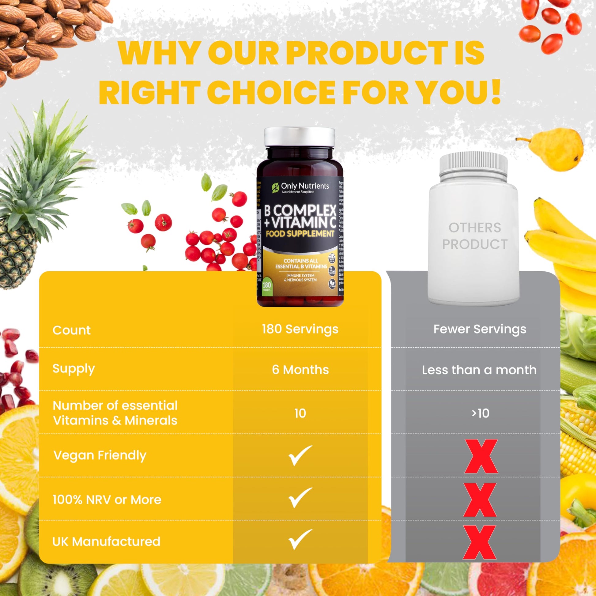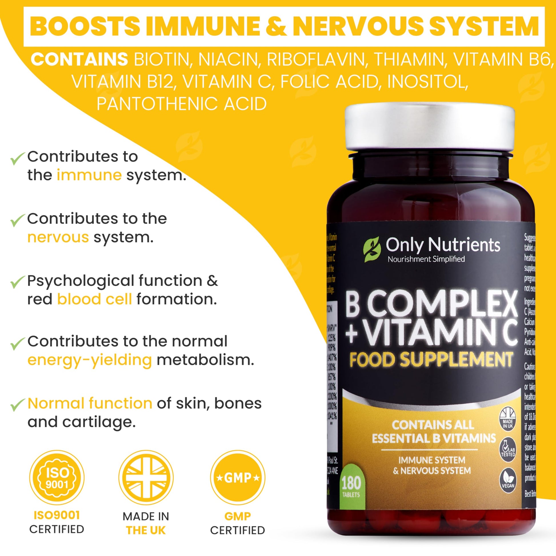 Only Nutrients | B Complex + Vitamin C | 180 Vegan Tablets (6 Months Supply) | All 8 B Vitamins B1-B2-B3-B5-B6-B12, Biotin, Folic Acid, Enhanced for Energy, Immune & Nervous System Support - UK Made