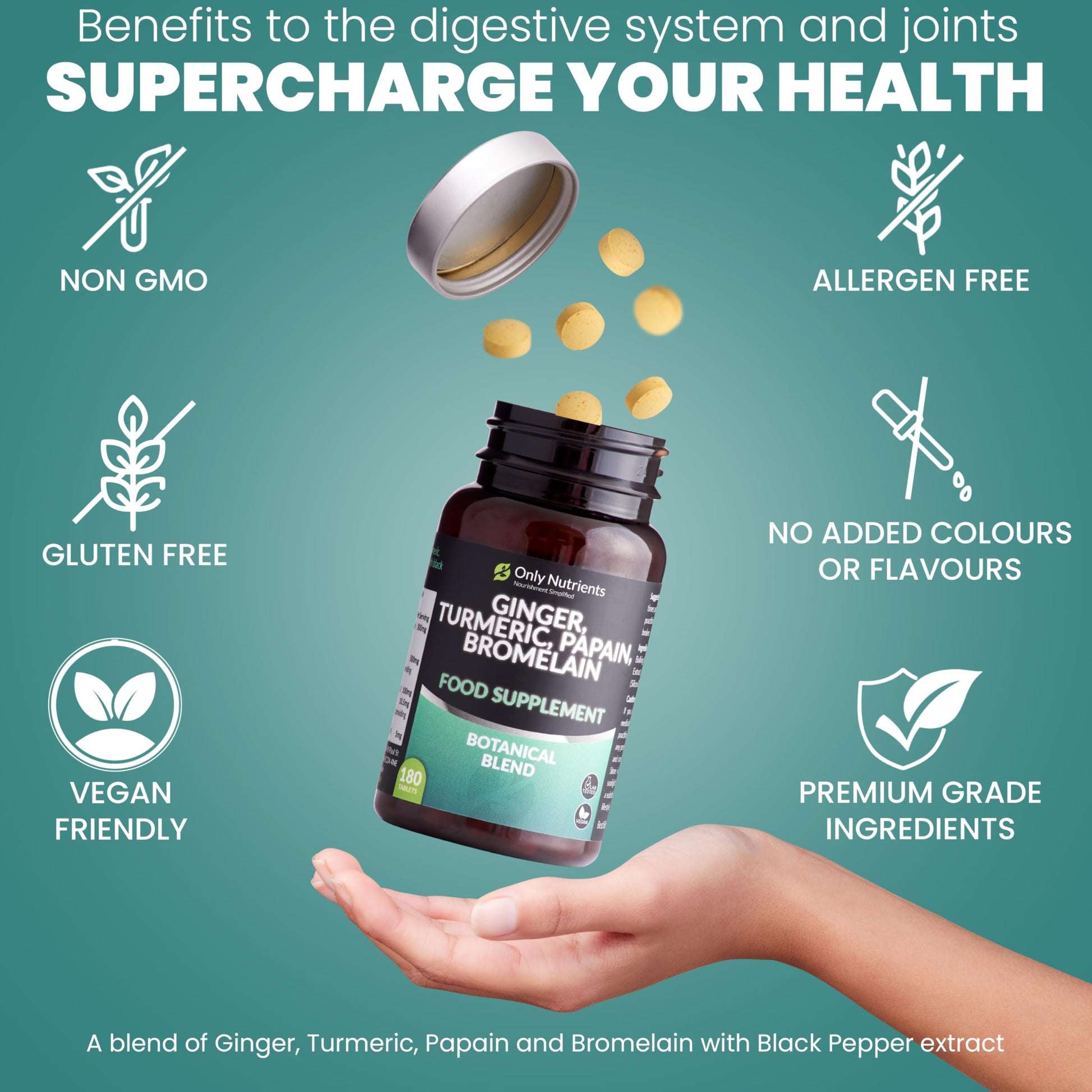Only Nutrients | Ginger Turmeric Bromelain & Papain with Black Pepper Extract | 180 High Strength Botanical Anti-Inflammatory Tablet Supplements | GMP Approved | UK Made