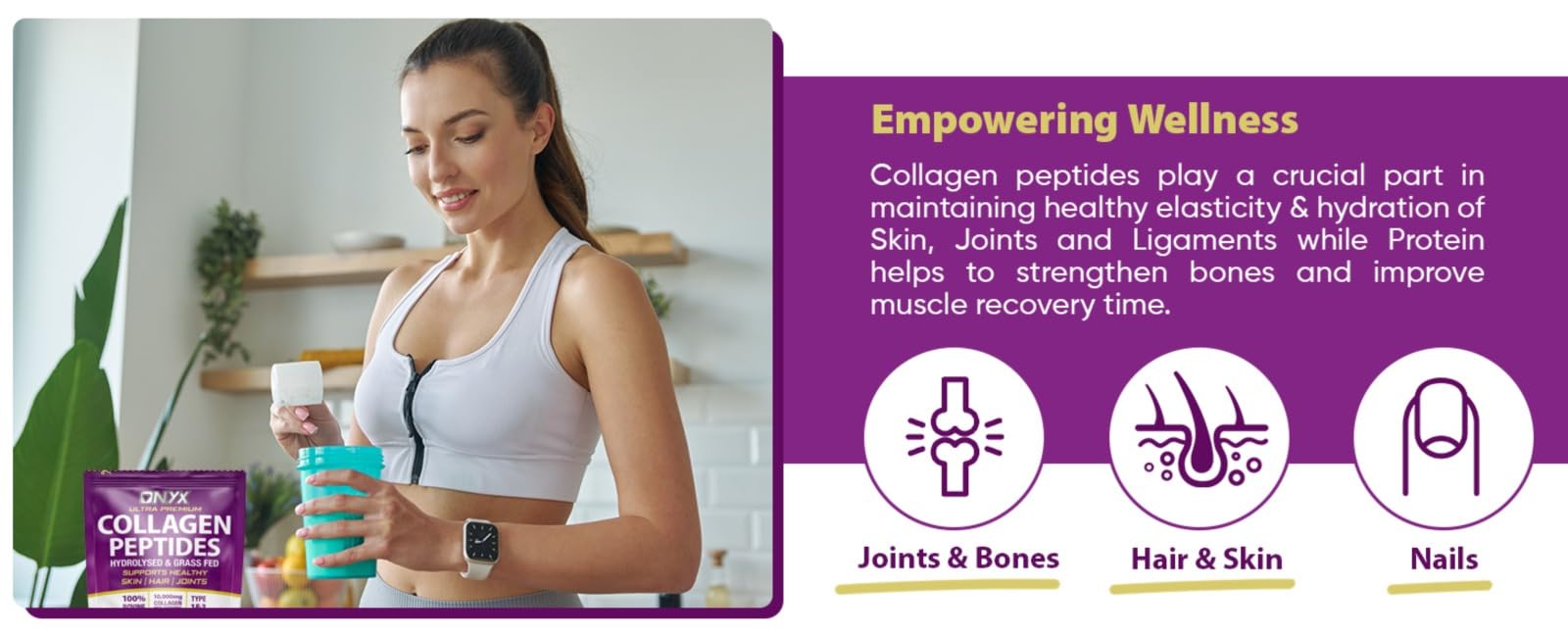 Product descriptionWhat is Onyx Collagen Bovine Peptides? Onyx Collagen Peptides provide a different way to add collagen to your diet to help promote beautiful hair and skin. Free from flavourings, one 10g scoop can be added to shakes, smoothies, coffees or baking recipes. What’s in our Collagen Peptides Bovine Powder? Our Collagen Peptides formula contains type I and type III collagen. This grass-fed collagen peptides formula is Non-GMO Project Verified, paleo-friendly and gluten-free. A 10g collagen scoop is designed to contribute to skin elasticity and beautiful hair. Our grass-fed Bovine Collagen peptides powder is: Designed to support a youthful appearance Easy to consume in shakes, smoothies or baking Contains no added hormones or antibiotics Non-GMO Project Verified, Paleo and Keto-Certified Gluten-free, dairy-free and soy-free. Collagen powder for women & men.Ingredients100% Pure Collagen Powder (Bovine)More Info