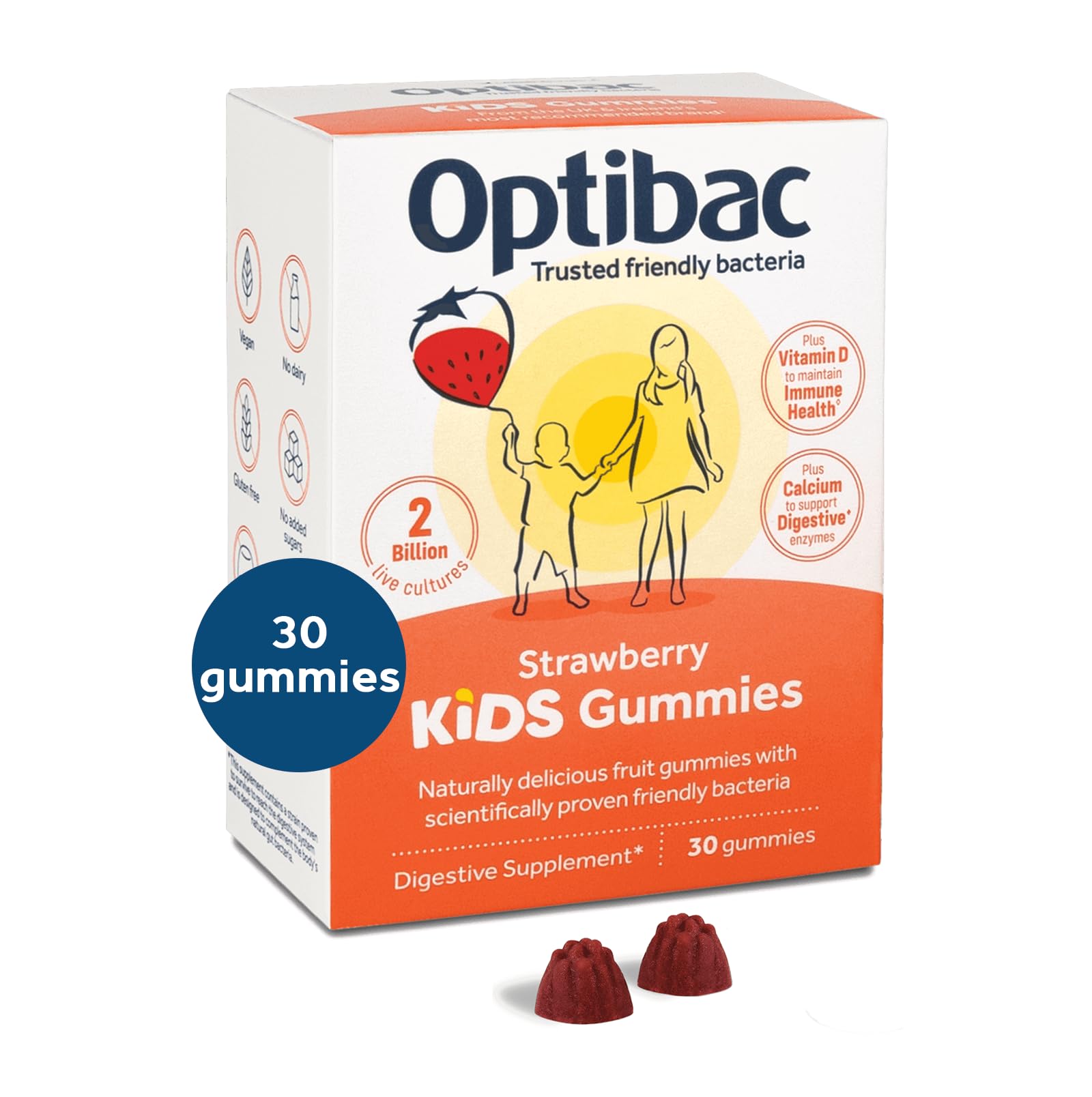 Here at Optibac, we have spent nearly 2 decades working with the most researched bacteria strains in the world. Our probiotic supplements are scientifically formulated to help you feel your best and support your health - naturally. We pride ourselves on being backed by credible science and all of our friendly bacteria strains are extensively researched in global leading laboratories. Our probiotics are easy to take and suitable for everyone. Optibac strawberry probiotic gummies for children are delicious & contains the scientifically proven strain Bacillus coagulans Unique IS-2 with FOS fibres to support kids' gut flora. Optibac guarantees 2 billion live probiotic bacteria per gummy, to optimise children's gut health. Vitamin D helps to maintain immune health whilst calcium supports digestive enzymes and bone health. This Optibac probiotic is vegan, gluten free, dairy free & free from added sugar, artificial flavourings or colourings . Simply give 1 real fruit gummy daily for a high quality probiotic for children.More Info