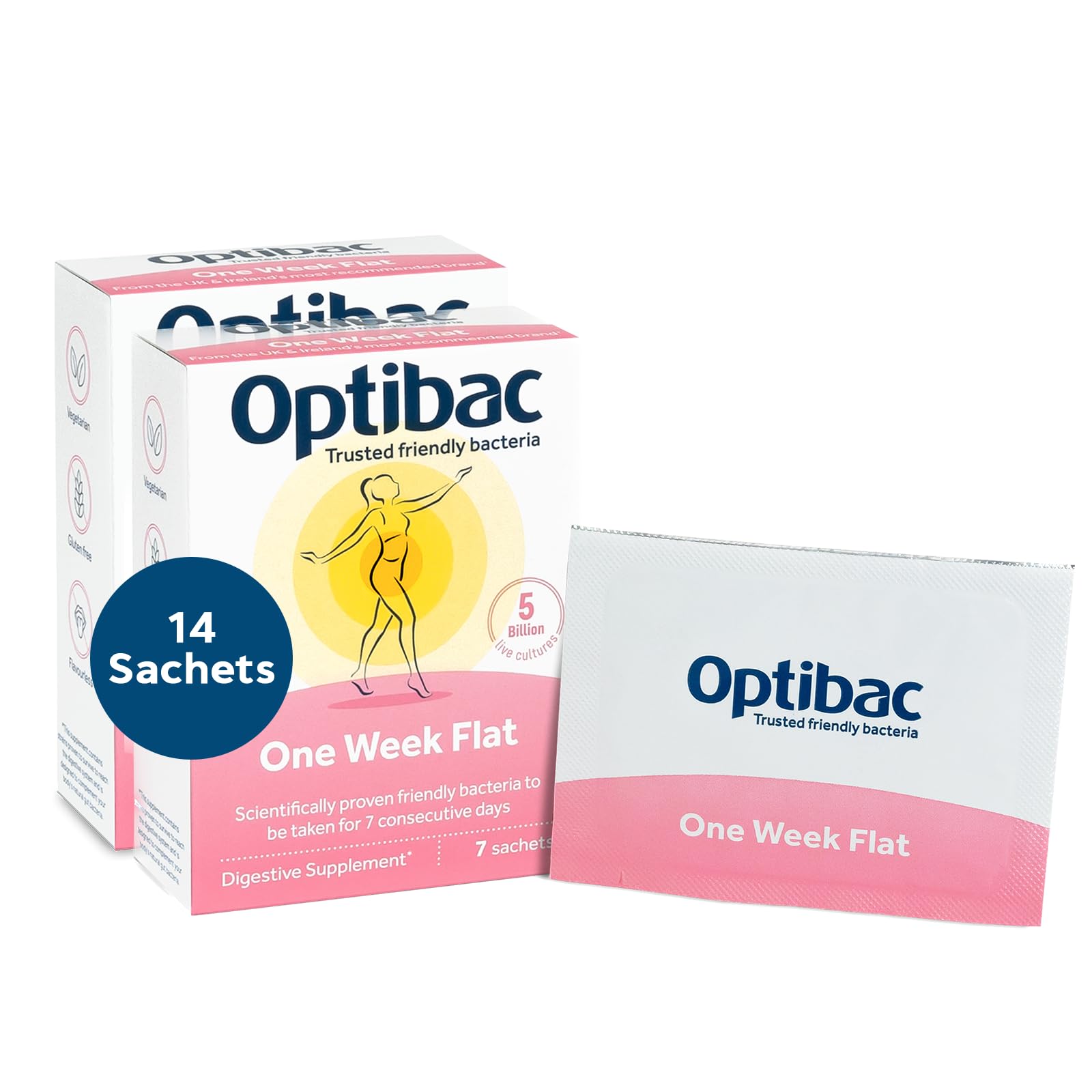 OptiBac Optibac Probiotics One Week Flat - Vegan Digestive Probiotic Supplement Suitable for Bloating with 5 Billion Bacterial Cultures - 2 Week Supply, 14 Sachets