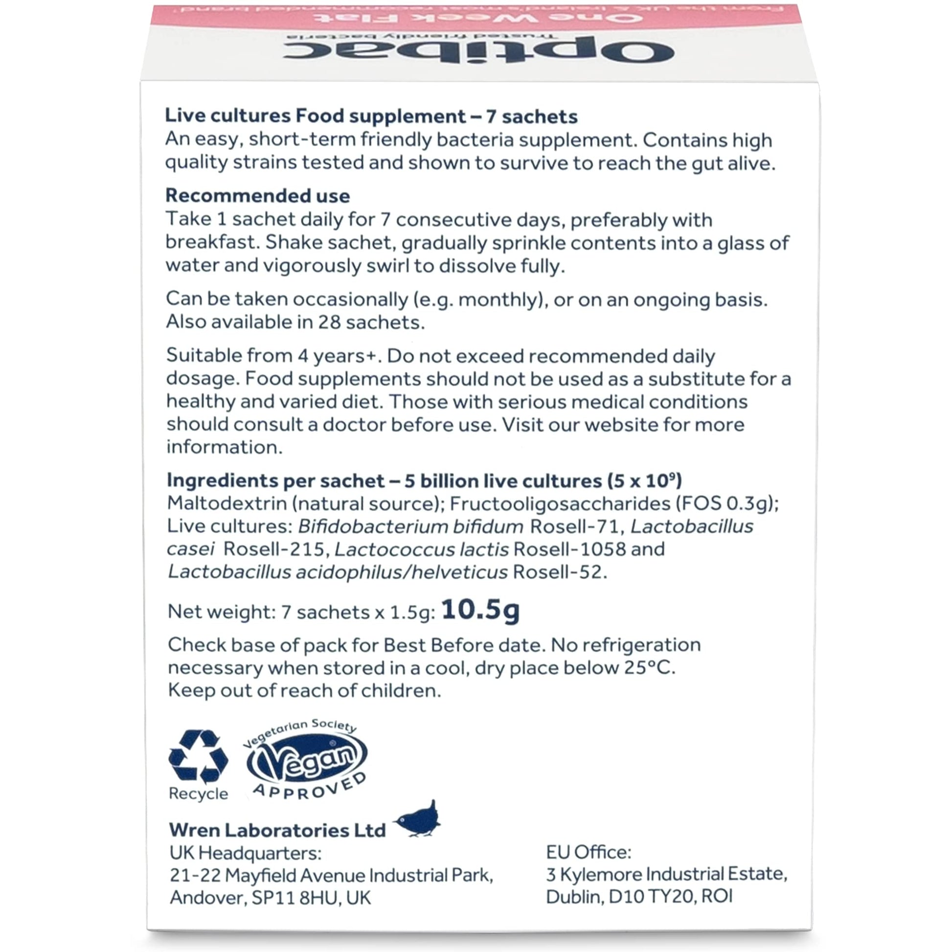 Here at Optibac, we have spent nearly 2 decades working with the most researched bacteria strains in the world. Our probiotic supplements are scientifically formulated to help you feel your best and support your health - naturally. We pride ourselves on being backed by credible science and all of our friendly bacteria strains are extensively researched in global leading laboratories. Our probiotics are easy to take and suitable for everyone. Optibac One Week Flat probiotics for bloating are scientifically proven to reach your gut alive and compliment your natural flora for effective bloating relief. Optibac guarantees 5 billion live probiotic bacteria in every capsule. Containing 4 high quality strains of bacteria, Bifidobacterium bifidum Rosell-71, Lactobacillus casei Rosell-215, Lactococcus lactis Rosell-1058 and Lactobacillus acidophilus/helveticus Rosell-52. This probiotic is vegan, gluten free & free from added sugar, artificial flavourings or colourings. Simply take one probiotic sachet daily, preferably with breakfast. Especially formulated probiotics for women, men and children over 4 years old.More Info