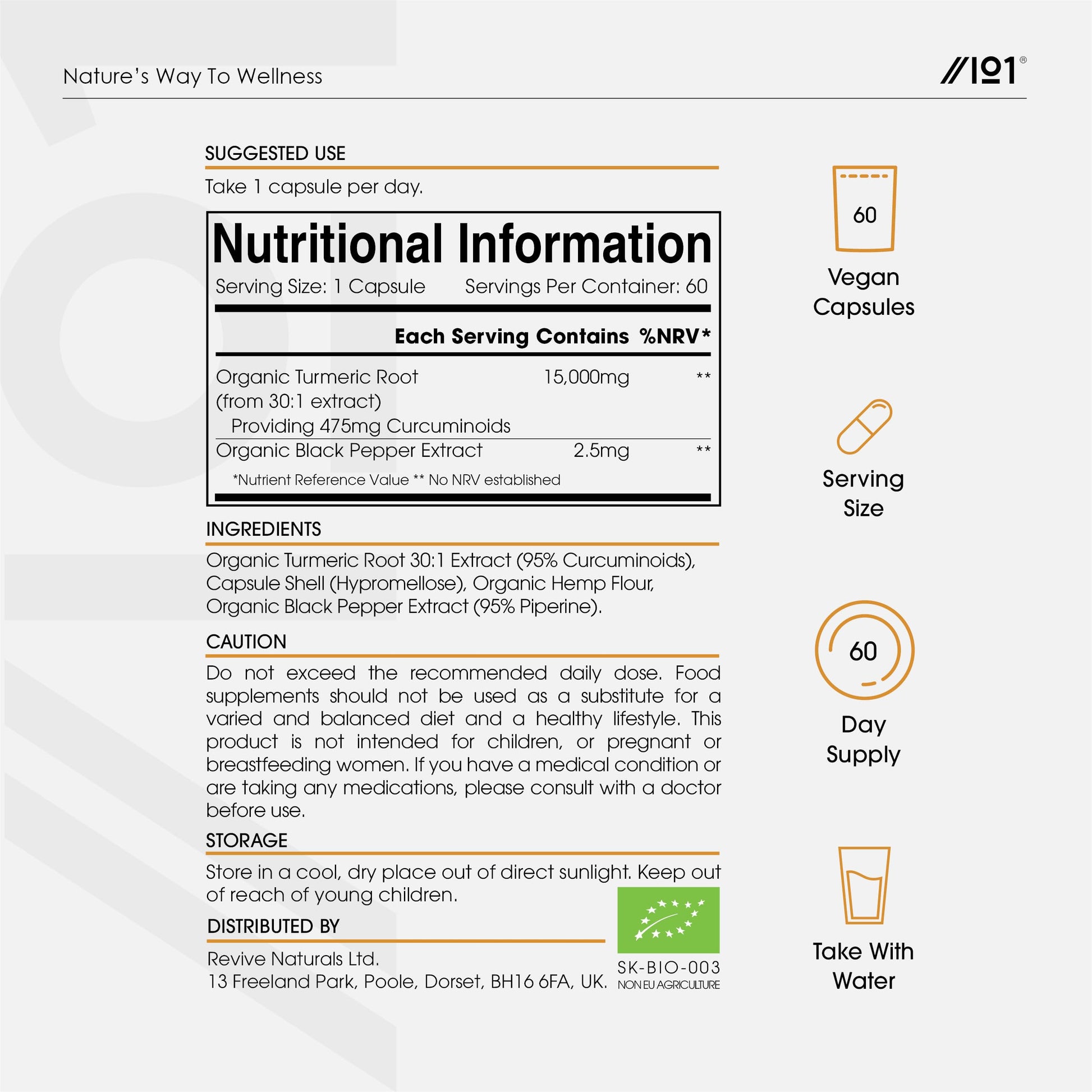 One of the most important spices in the world, Turmeric has been used in India for thousands of years and is a rich source of curcuminoids. Each capsule contains the botanical equivalent of 15,000mg of Organic Turmeric Root, providing 475mg of naturally-occurring curcuminoids, which has been combined with organic black pepper extract for increased absorption.More Info