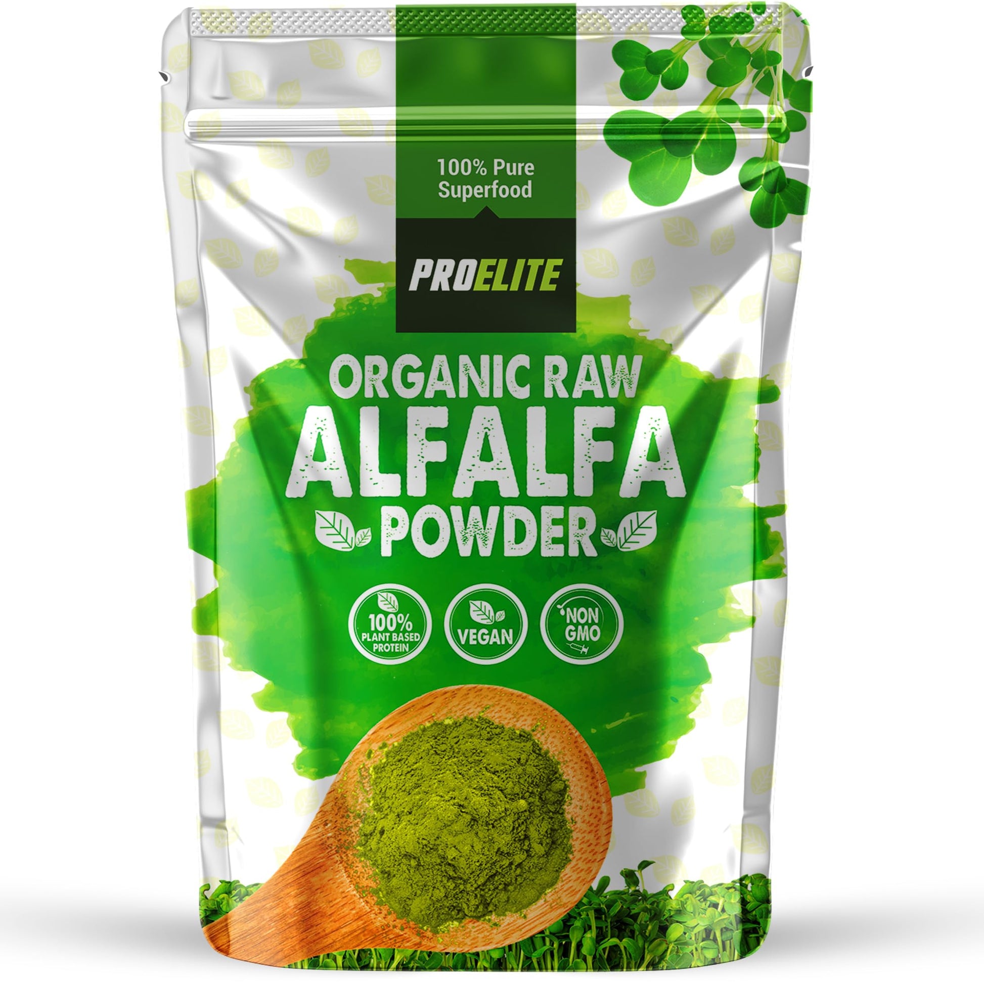 Alfalfa a unique complete food was once known in ancient Arab civilizations as the “Father of all foods”. Scientific studies have revealed that alfalfa contains almost all the known vitamins, minerals and trace elements needed for premium health.PROELITE Alfalfa powder is made from fresh, green, vigorously growing plants of Medicago sativa and contains no additives or artificial colors.