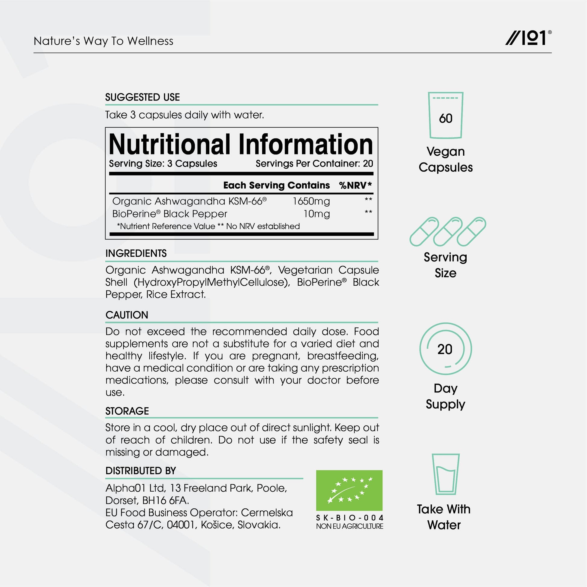 Organic Ashwagandha KSM-66® with BioPerine® - 1650mg - 5% Withanolides - Most Bioavailable Full-Spectrum Root Extract - Not Tablets or Powder - 60 Vegan Capsules Bag
