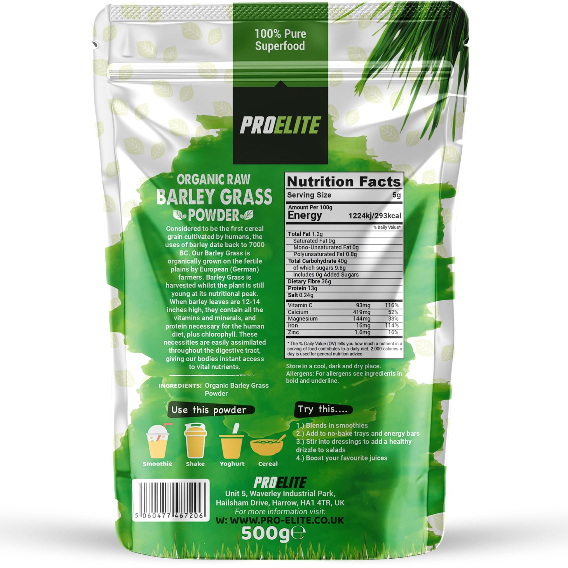 Organic Barley Grass Powder 500g - Certified Organic Grown in EU - 100% Raw Natural Gluten Free Superleaf Superfood Powder for Smoothies & Juices PROELITE