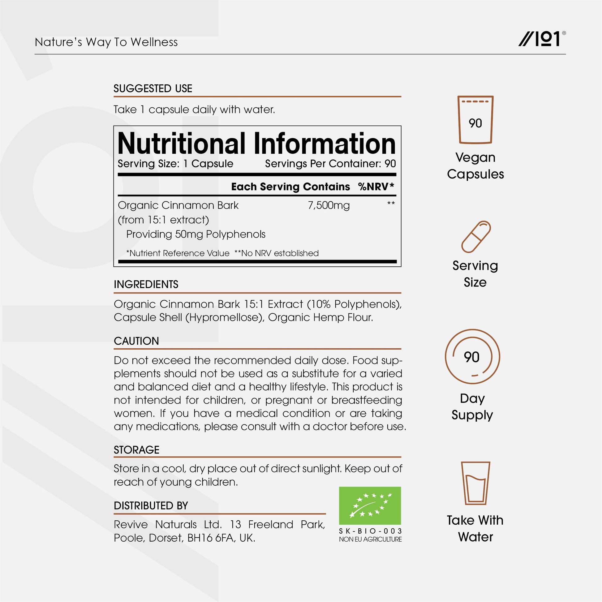 Organic Cinnamon Extract 7,500mg - 10% Polyphenols High Strength 15:1 Extract - 90 Vegan Capsules (3 Months Supply) - Resealable and Recyclable Pouch – by Alpha01