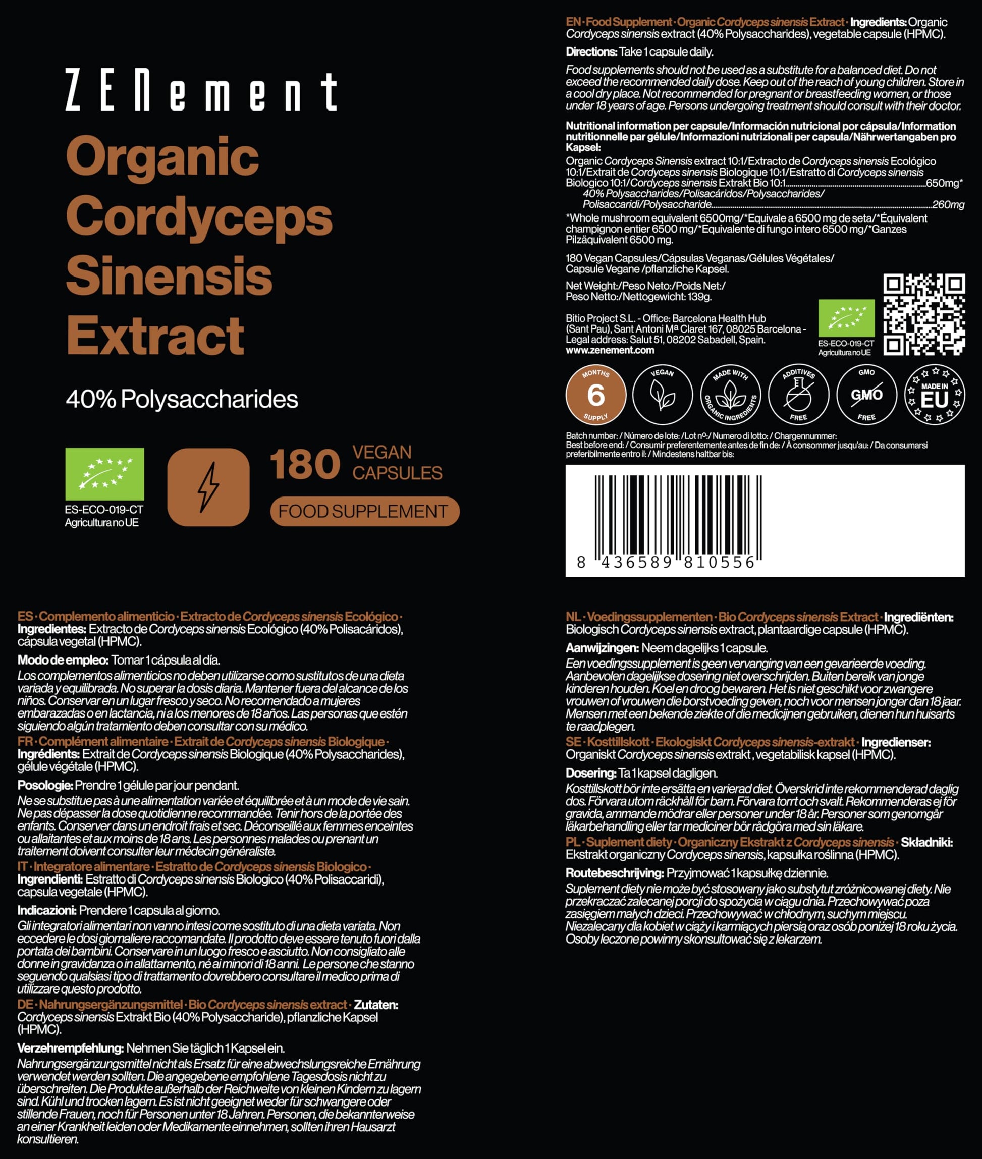 Organic Cordyceps Sinensis, 180 Capsules (6-Month Supply) | Mushroom Extract Powder Supplement | 650mg of Authentic CS-4 Extract, 40% bioactive Polysaccharides | Vegan, No Additives | Zenement