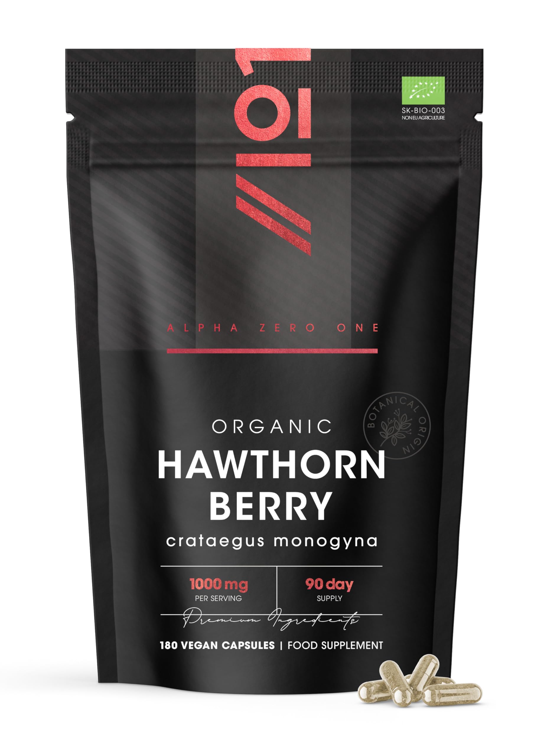 Organic Hawthorn Berry 1000mg – 180 Vegan Capsules – High Strength Crataegus Monogyna Supplement – Clean & Potent Formula – Resealable and Recyclable Pouch by Alpha01