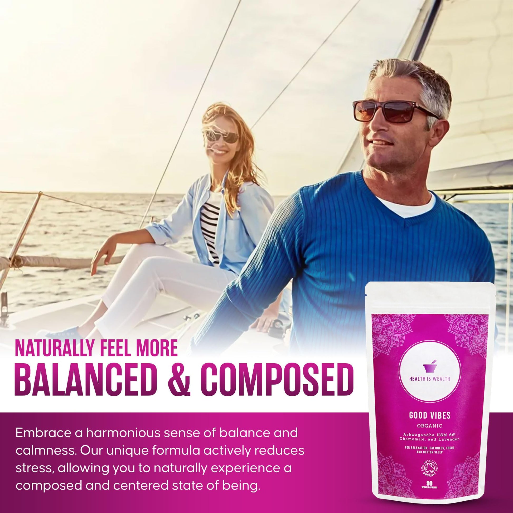 90 Vegan Capsules. This unique supplement combines multiple potent organic herbal ingredients for maximum impact. KSM 66 Ashwagandha, combined with Lavender and Chamomile is very effective at reducing stress hormones and inducing a sense of calm. You should feel a noticeable effect on sleep within 1 to 2 days, and lower stress, and calmer within 3 - 4 days of continued use. The blend's effectiveness makes this easy-to-swallow capsule a perfect solution for people suffering from sleep or stress problems. Our product contains 300 milligram of Organic KSM Ashwagandha, 200 milligram of Organic Chamomile, and 100 grams of Organic Lavender. Completely organic and natural - even the capsule shells are made from plant fibres. Organic plants have a higher nutritional value than conventional supplements because of the absence of pesticides and fertilisers. This restores the plant's natural healing qualities and boosts the production of phytochemicals (vitamins and antioxidants). They are also much better for the environment, including animals. At Good Health True Wealth, we care about the environment. That s why we ve ensured that our packaging is 100% compostable, leaving no harmful waste behind. We also believe that the survival of bees is vital as they play a crucial role in our ecosystem. They actually pollinate 75% of our essential food crops. To ensure they get the help they need, we donate 50 Percent of every sale to the Bumblebee Conservation Trust.More Info