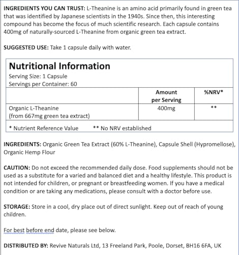 Organic L-Theanine 400mg from Green Tea Extract - 60 V Capsules (2 Months Supply) - High Strength Theanine Amino Acid Supplement - by Alpha01