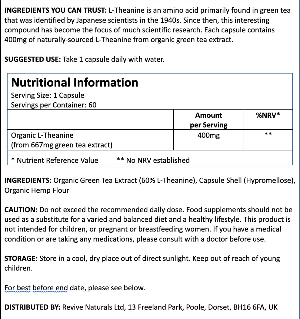 L-Theanine is an amino acid primarily found in green tea that was identified by Japanese scientists in the 1940s. Since then, this interesting compound has become the focus of much scientific research. Each capsule contains 400mg of naturally-sourced L-Theanine from organic green tea extract.More Info